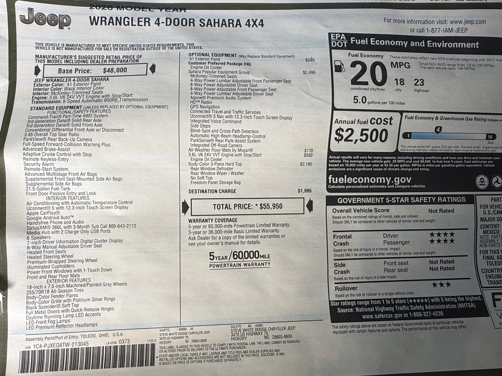 This is a all new 2018 Jeep Wrangler JL Unlimited Sahara SUV 4WD with the 6 Speed Manual Transmission. It comes with the 3 year - 36,000 mile Factory Bumper to Bumper Warranty as well as a 5 year - 60,000 Factory Powertrain Warranty. It is equipped with Keyless Entry, Remote Start, Command-Trac Part Time 4 WD System, 3.45 Gear Ratio, Anti Spin Differential Rear Axle, Engine Block Heater, Power Heated Mirrors, Tan Leather Seats, Heated Front Seats, Power Windows & Locks, Cruise Control, A/C with Dual Zone Automatic Temperature Control, UConnect 4C, 8.4in Display, AM/FM/HD/SXM, Alpine Premium Sound System w/ Sub Woofer, GPS Navigation, Audio Jack Input for Mobile Devices, Apple Car Play & Google Android Auto Capable, UConnect Voice Command with Bluetooth, ParkView Rear Back up Camera, Heated Leather Wrapped Steering Wheel w/ Mounted Audio Controls, 12-Volt Auxiliary Power Outlet, Transfer Case/Fuel Tank Skid Plate, Tubular Side Steps, Torx Tool Kit, LED Lighting Group, LED Reflector Head Lamps, LED Fog Lamps, LED Tail Lamps and 1 year free subscription to Sirius/XM Radio. Due to shortage of soft tops, Chrysler will be sending soft tops at a later date.