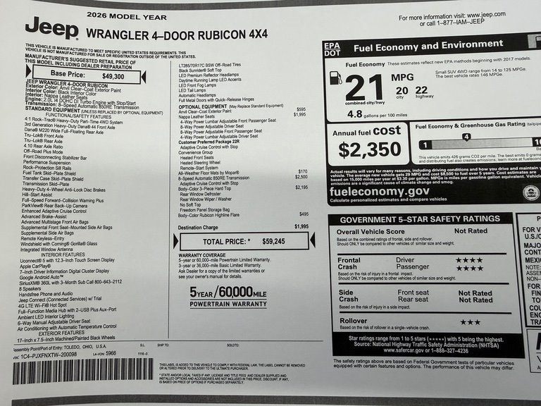 2026 Jeep Wrangler 4 Door Rubicon Body Color Hard Top SUV