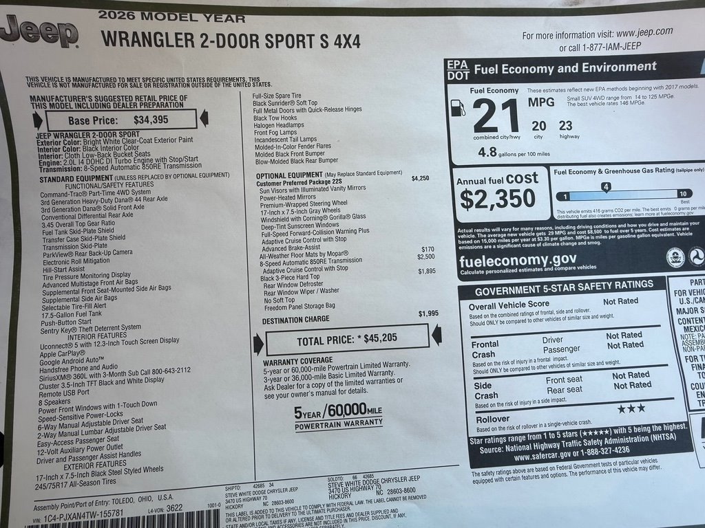This is a all new 2018 Jeep Wrangler JL Unlimited Sahara SUV 4WD with the 6 Speed Manual Transmission. It comes with the 3 year - 36,000 mile Factory Bumper to Bumper Warranty as well as a 5 year - 60,000 Factory Powertrain Warranty. It is equipped with Keyless Entry, Remote Start, Command-Trac Part Time 4 WD System, 3.45 Gear Ratio, Anti Spin Differential Rear Axle, Engine Block Heater, Power Heated Mirrors, Tan Leather Seats, Heated Front Seats, Power Windows & Locks, Cruise Control, A/C with Dual Zone Automatic Temperature Control, UConnect 4C, 8.4in Display, AM/FM/HD/SXM, Alpine Premium Sound System w/ Sub Woofer, GPS Navigation, Audio Jack Input for Mobile Devices, Apple Car Play & Google Android Auto Capable, UConnect Voice Command with Bluetooth, ParkView Rear Back up Camera, Heated Leather Wrapped Steering Wheel w/ Mounted Audio Controls, 12-Volt Auxiliary Power Outlet, Transfer Case/Fuel Tank Skid Plate, Tubular Side Steps, Torx Tool Kit, LED Lighting Group, LED Reflector Head Lamps, LED Fog Lamps, LED Tail Lamps and 1 year free subscription to Sirius/XM Radio. Due to shortage of soft tops, Chrysler will be sending soft tops at a later date.