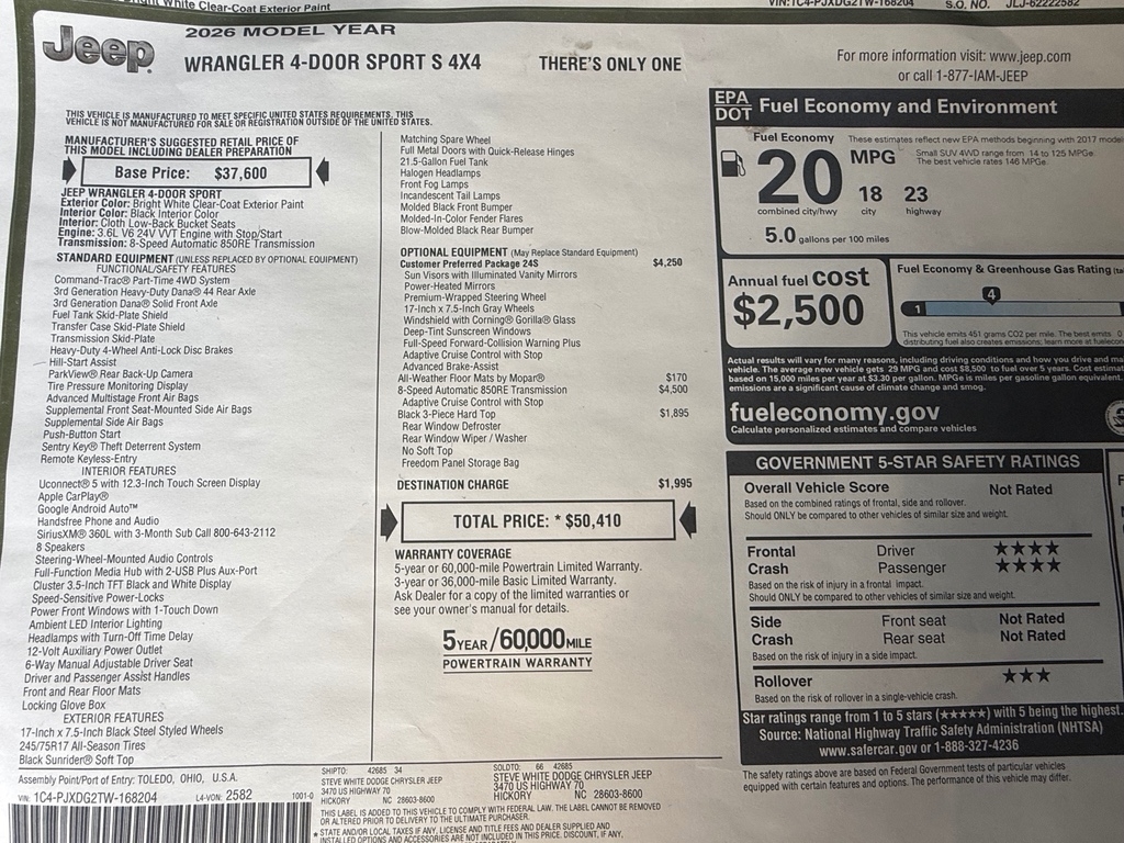 2026 Jeep Wrangler Sport S 4 Door Hard Top V6 SUV