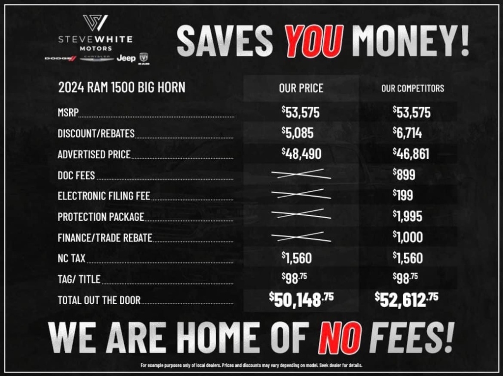 There are no additional FEES/ADD ONS to be added to our price!  This saves you up to $1500 over what other dealers charge in extra fees including Documentary, Notary, Prep, ADM, and Environmental.  We are one of the only stores in the USA with no fees, that is why we sell all over the country - saving our customer's thousands! Many customers don't realize how much in extra fees they pay when buying a car.