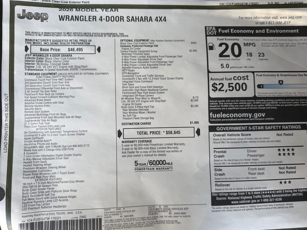 This is a all new 2018 Jeep Wrangler JL Unlimited Sahara SUV 4WD with the 6 Speed Manual Transmission. It comes with the 3 year - 36,000 mile Factory Bumper to Bumper Warranty as well as a 5 year - 60,000 Factory Powertrain Warranty. It is equipped with Keyless Entry, Remote Start, Command-Trac Part Time 4 WD System, 3.45 Gear Ratio, Anti Spin Differential Rear Axle, Engine Block Heater, Power Heated Mirrors, Tan Leather Seats, Heated Front Seats, Power Windows & Locks, Cruise Control, A/C with Dual Zone Automatic Temperature Control, UConnect 4C, 8.4in Display, AM/FM/HD/SXM, Alpine Premium Sound System w/ Sub Woofer, GPS Navigation, Audio Jack Input for Mobile Devices, Apple Car Play & Google Android Auto Capable, UConnect Voice Command with Bluetooth, ParkView Rear Back up Camera, Heated Leather Wrapped Steering Wheel w/ Mounted Audio Controls, 12-Volt Auxiliary Power Outlet, Transfer Case/Fuel Tank Skid Plate, Tubular Side Steps, Torx Tool Kit, LED Lighting Group, LED Reflector Head Lamps, LED Fog Lamps, LED Tail Lamps and 1 year free subscription to Sirius/XM Radio. Due to shortage of soft tops, Chrysler will be sending soft tops at a later date.