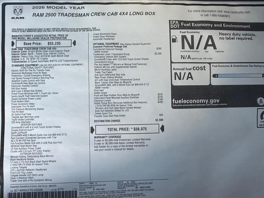 • Style Name: Tradesman Crew 4WD HEMI 8' Service Body 4 Dr