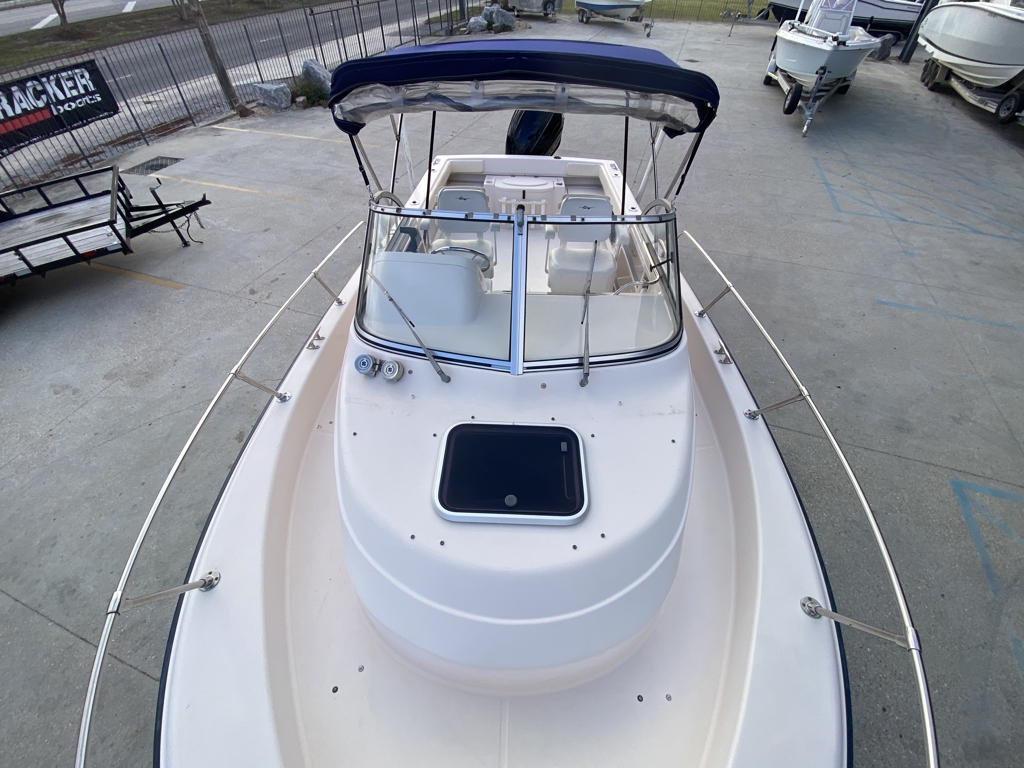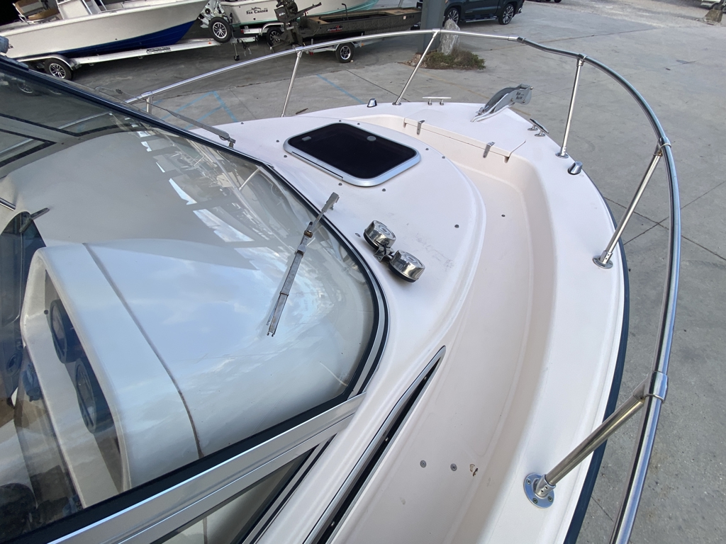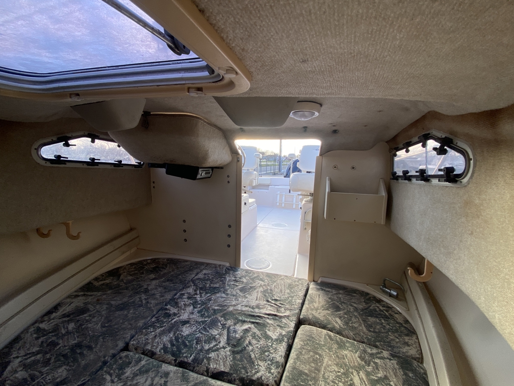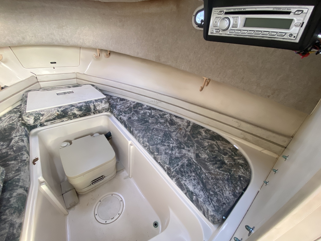The cuddy cabin is in excellent condition with great upholstery. Includes bow cushions and a cellophane windshield enclosure for all-weather comfort.