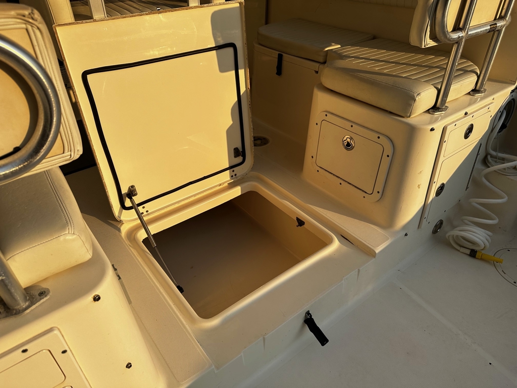 Expansive cockpit with molded-in rod storage, tackle storage units, 40-gallon insulated re-circulating livewell, insulated bait-prep station, raw water washdown, freshwater cockpit shower, fighting chair reinforcement, and toe rail