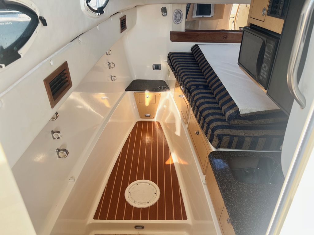 Full cabin featuring master berth, aft quarter berth, galley, standing shower, Vacu-Flush head with holding tank and overboard discharge, integrated storage, stylish fabrics and lighting