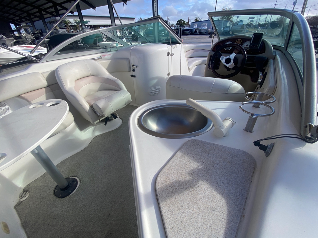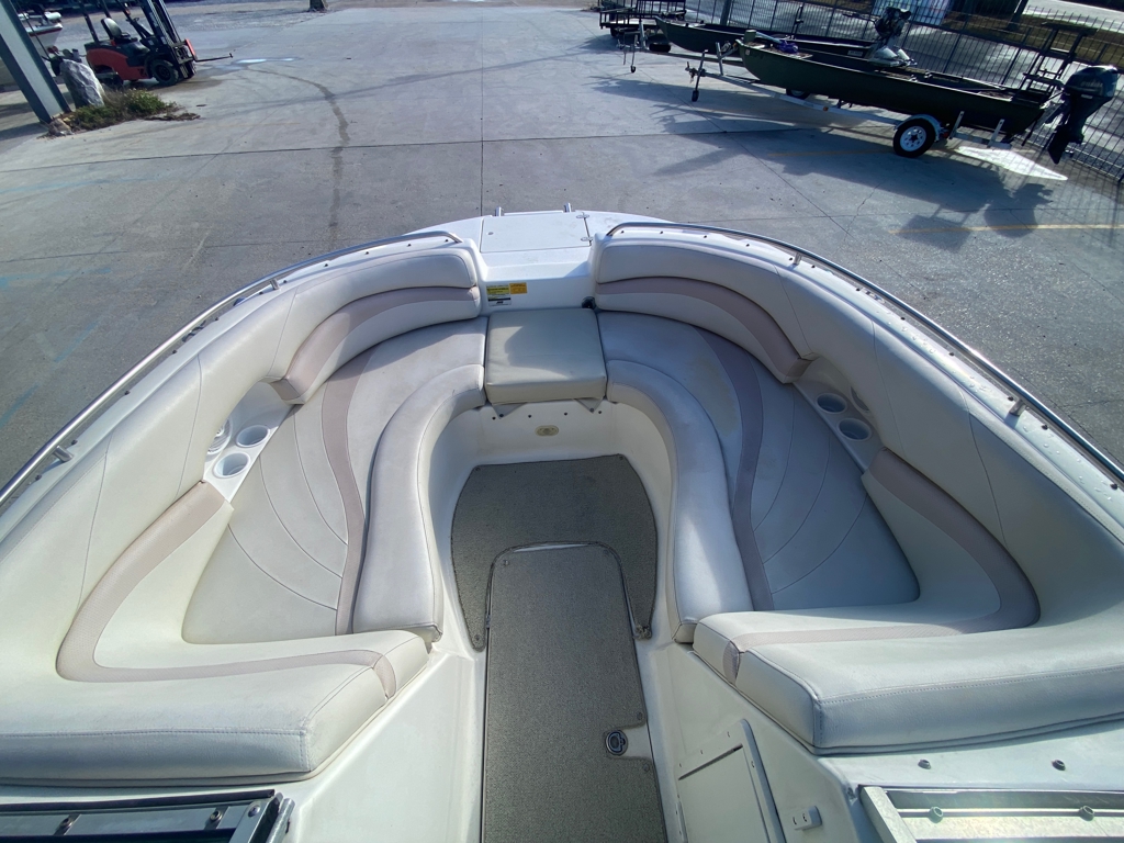 For comfort and convenience, the boat features a wet bar and a dock-tail table, making it great for entertaining. It is also equipped with both front and rear swim ladders for easy water access. For anglers, a custom bow fishing deck is included, adding extra versatility. A full boat cover also comes with the boat to help protect it when not in use.