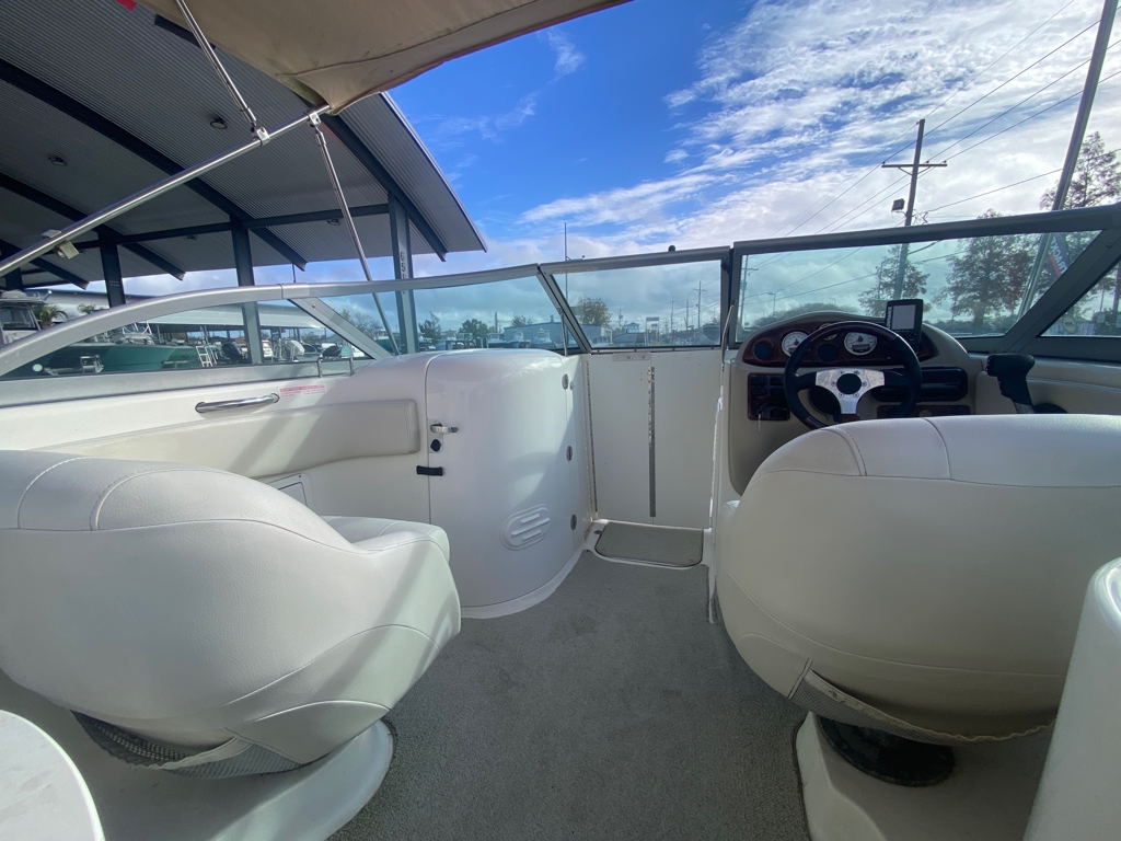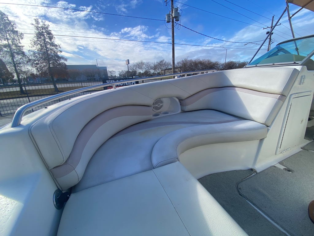 The boat comes on a tandem-axle trailer, making transport and storage easy. Upholstery is in great condition, reflecting the care this boat has received. A Bimini top provides shade on sunny days, and a brand-new Sony stereo system with a Bazooka subwoofer delivers excellent sound on the water.