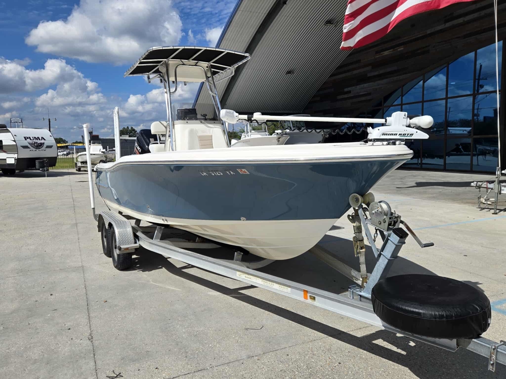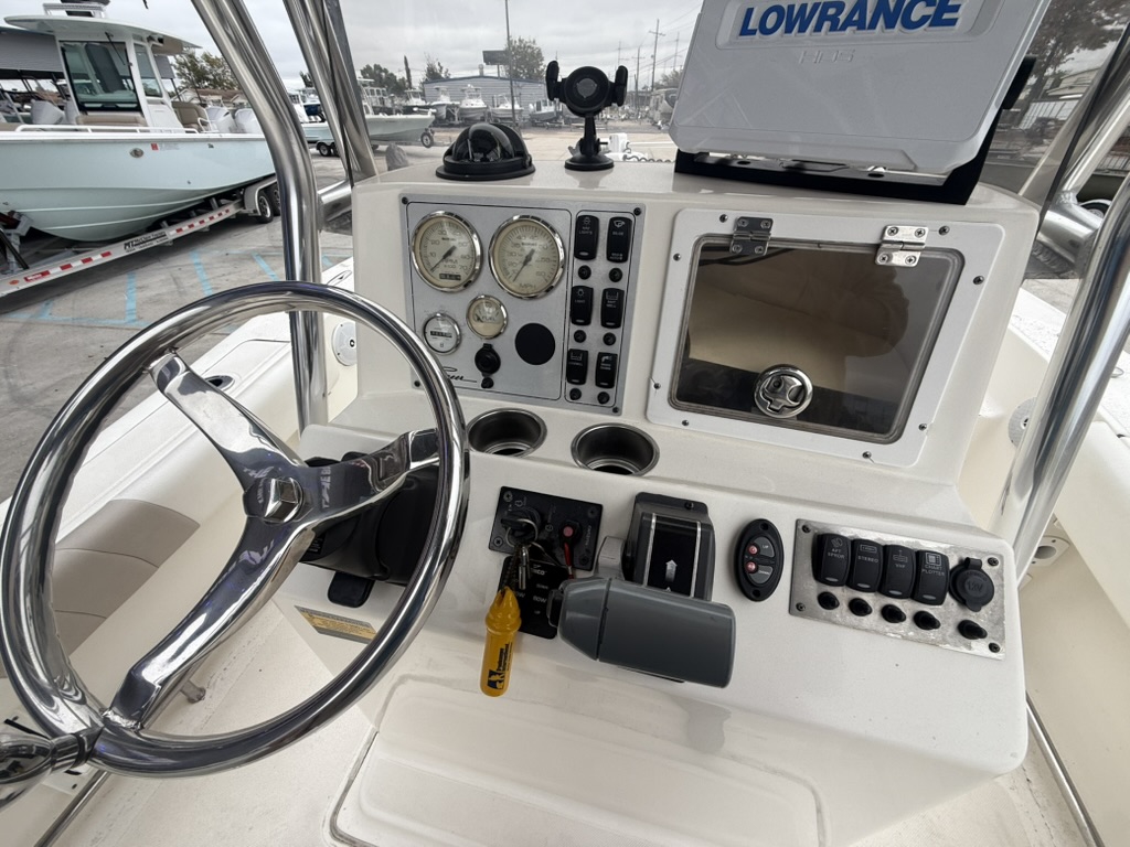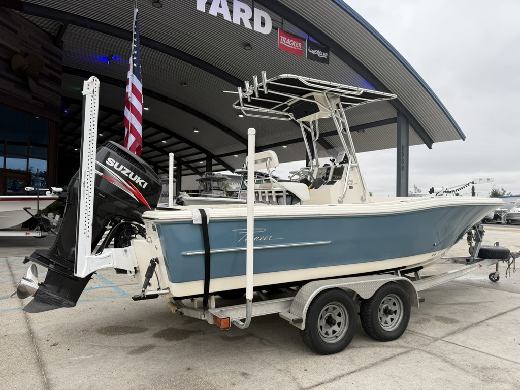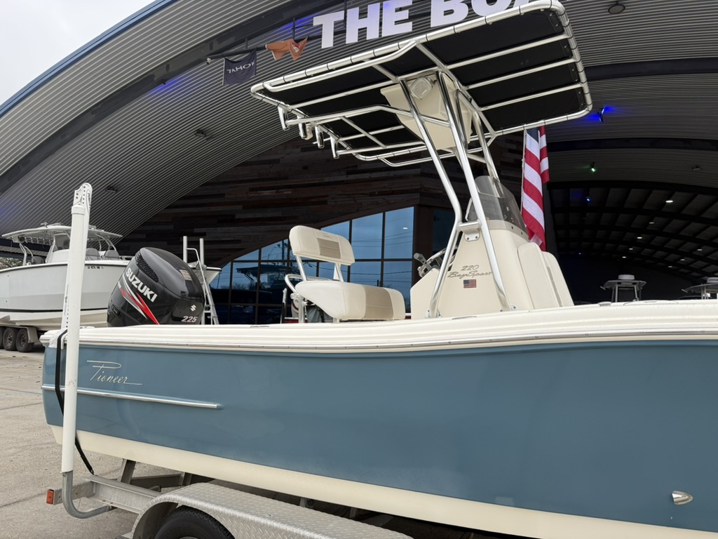 The 2010 Pioneer 220 Bay Sport is a hybrid center console boat designed for versatile use in shallow bays, rivers, and coastal waters. Key features include a fiberglass hull, a foam-filled unsinkable design, a shallow draft of about 13 inches, and seating for up to eight people. It is well-equipped for fishing with insulated fish boxes, livewells, and ample rod storage, while also offering comfortable seating and amenities for family recreation.