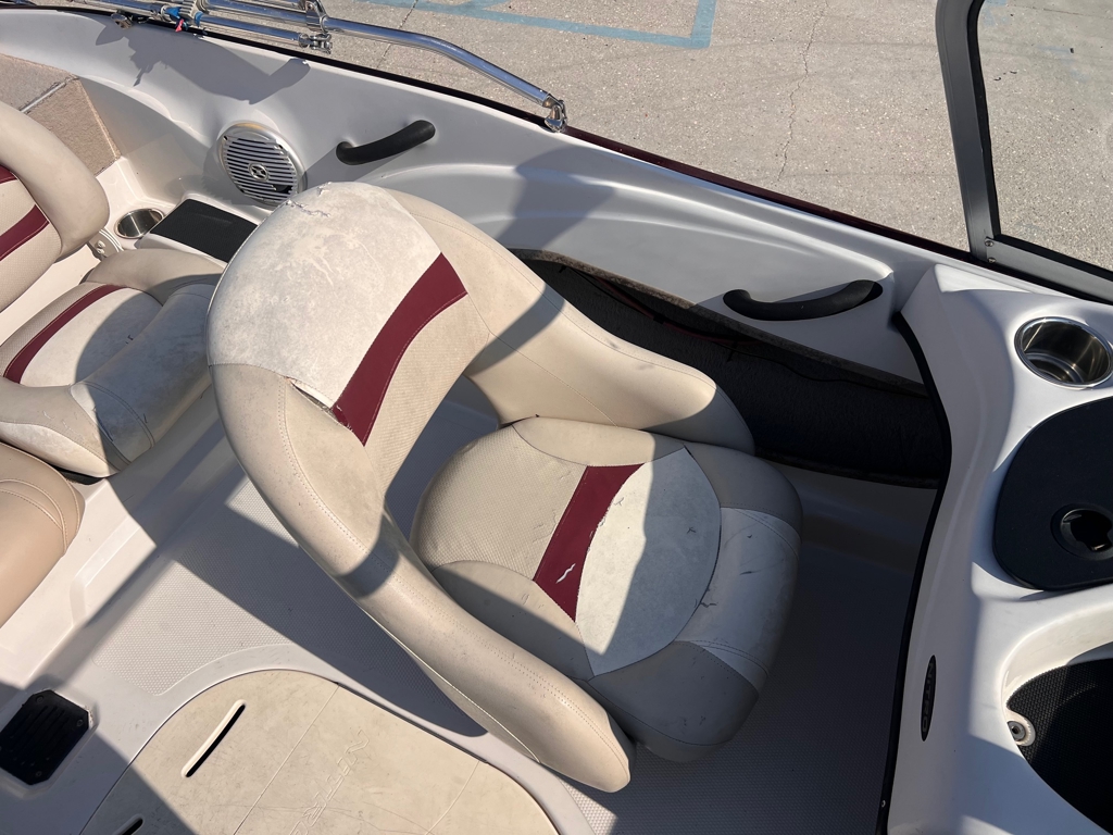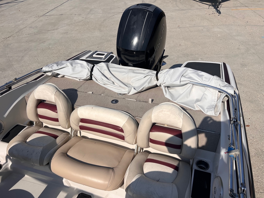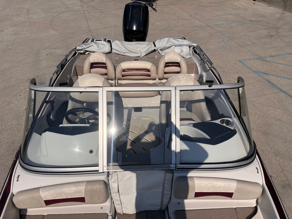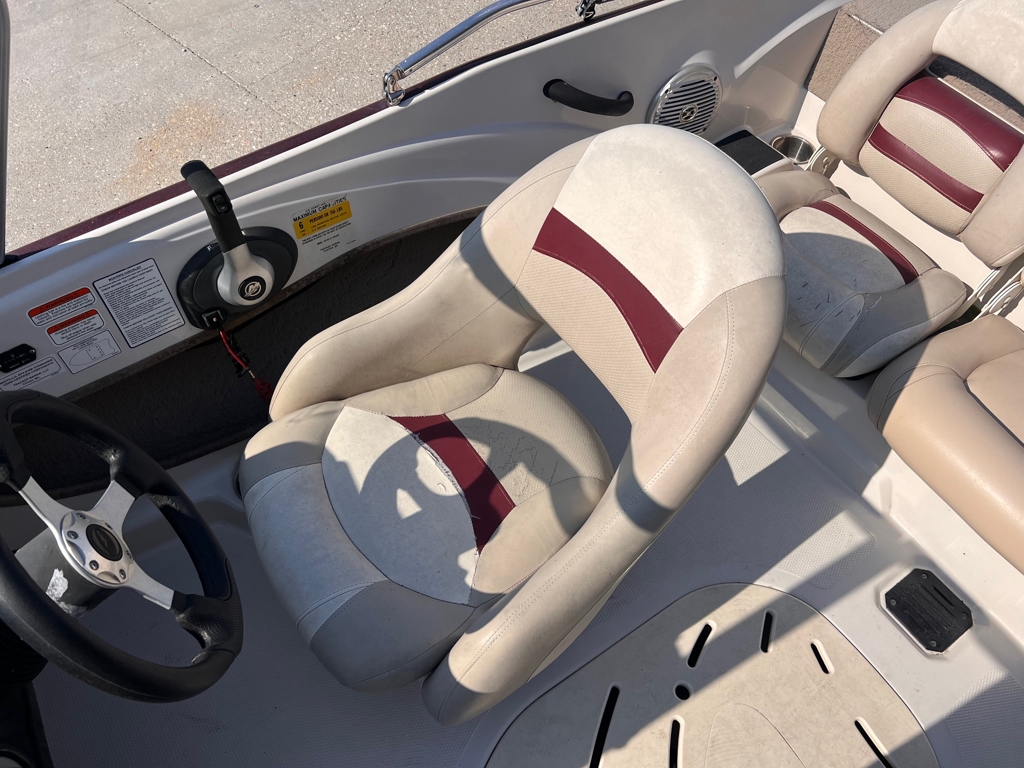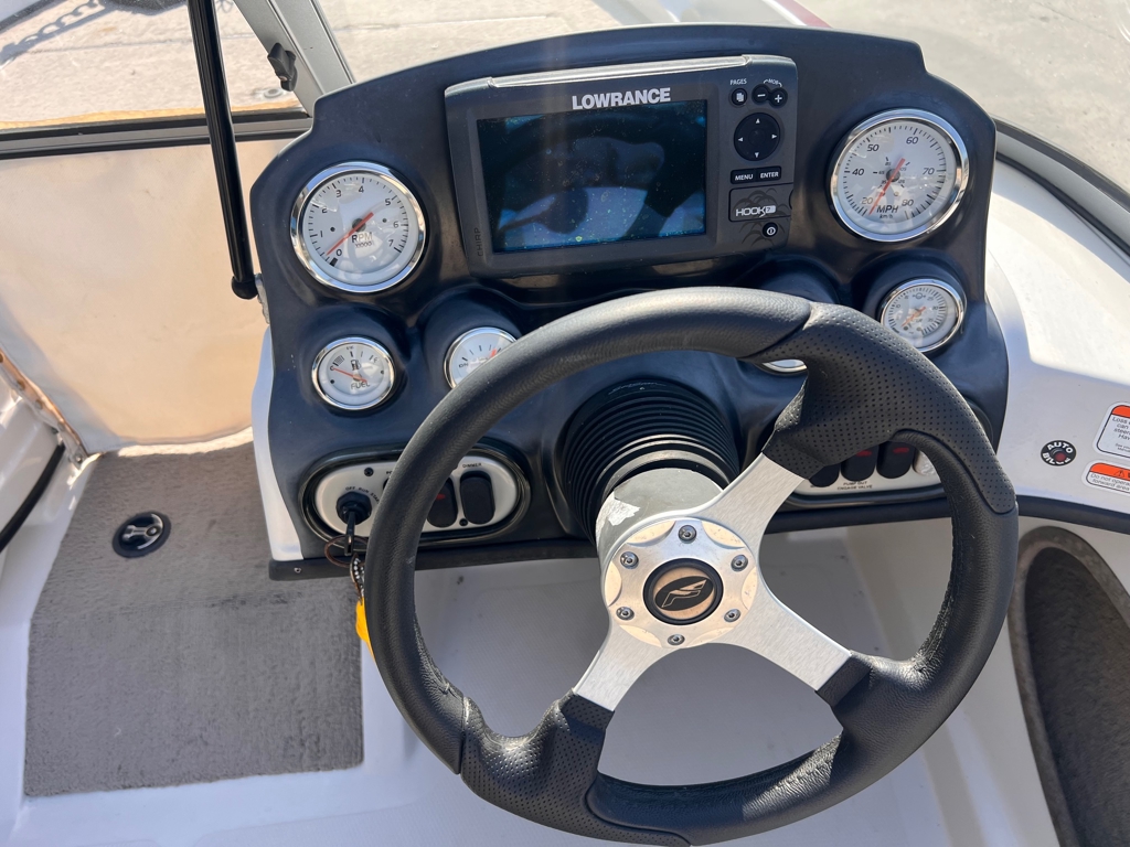 The 2012 Nitro Z7 Sport is an 18-foot, 8-inch fiberglass fishing and recreational boat with a 7-foot, 8-inch beam, a dry weight of 1,650 pounds, and a 41-gallon fuel capacity. It features an a trolling motor, a built-in cooler, and storage for fishing rods and gear. The Z7 Sport is designed for mixed activities, offering seating for five, a sun lounge, a livewell, and a stereo system, all supported by a matching trailer with a swing-away tongue