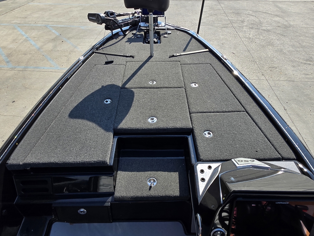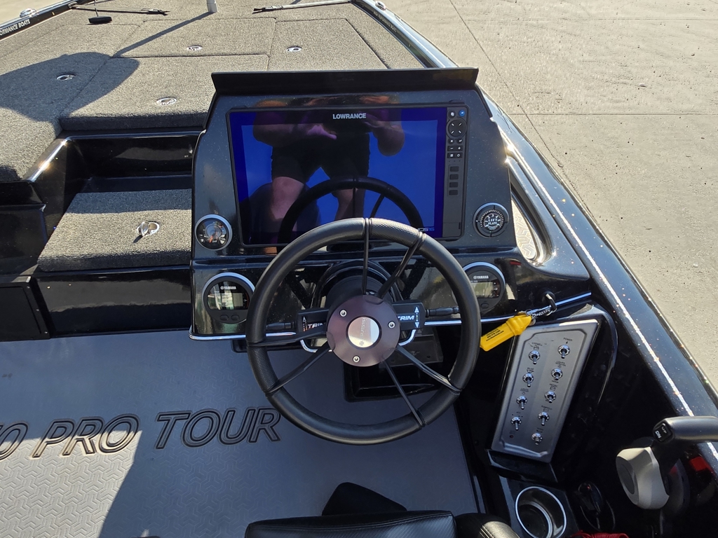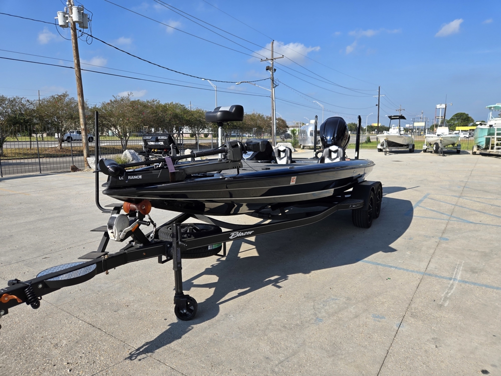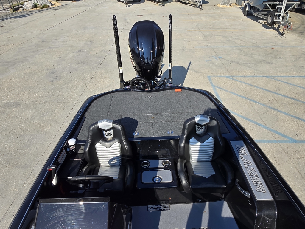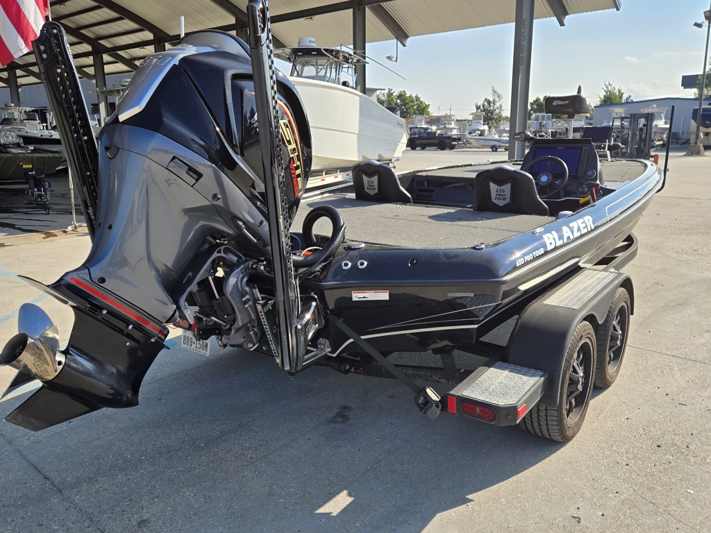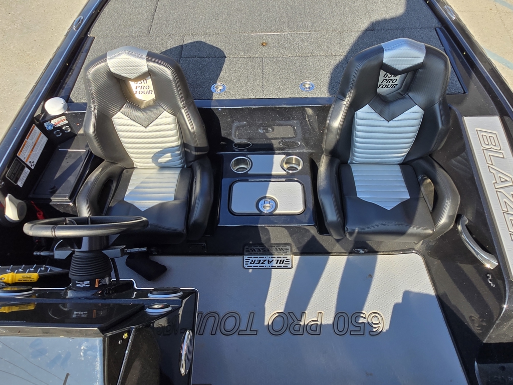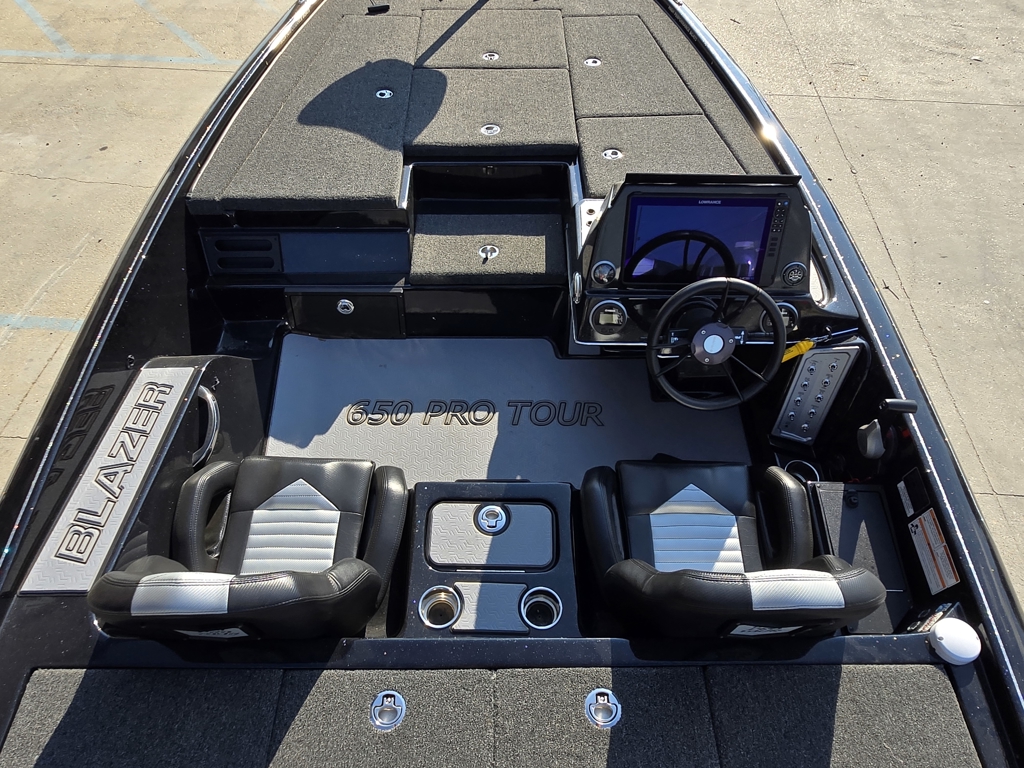 The 2024 Blazer 650 Pro Tour is a high-performance, 21-foot bass boat built for tournament anglers and recreational use, known for its speed, stability, and extensive fishing-focused features. It features a 100% composite construction, a spacious padded front deck, a large 40-gallon livewell, and versatile storage for tackle and rods. The boat is designed for comfort with contoured bucket seats and a custom dash, offering a secure and comfortable ride thanks to its well-designed cockpit and driver's seat. It's often equipped with advanced electronics like Garmin or Lowrance screens, a powerful trolling motor, and a reliable engine, such as the Mercury Pro XS or Yamaha.