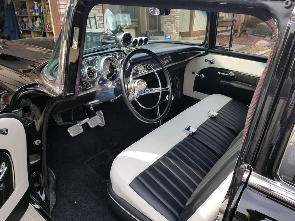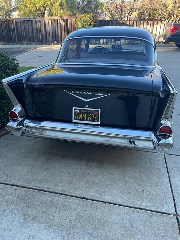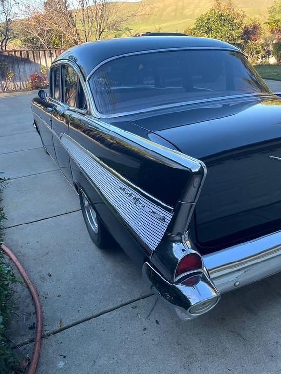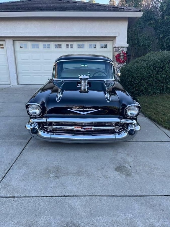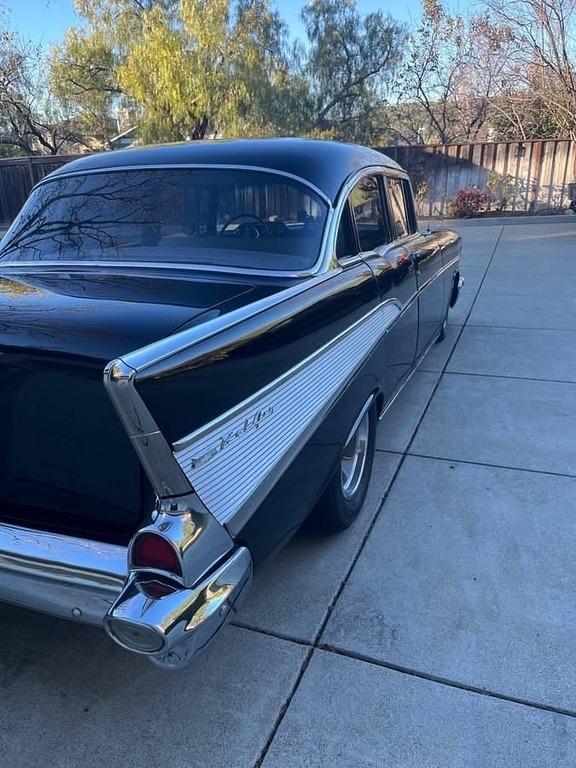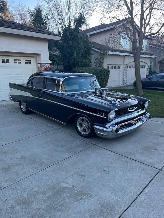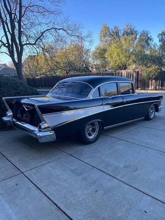 This 1957 Chevrolet Bel Air is a customized 60s-style hot rod that blends iconic Tri-Five styling with serious performance upgrades. Originally a 4-door sedan, the rear door handles have been shaved to give it the clean appearance of a 2-door build, creating a sleek and unique profile. Under the hood is a powerful 383 Stroker engine paired with a tunnel ram intake and Fitech dual quad EFI system, delivering strong performance and modern fuel management. Power is sent through a 4-speed Muncie manual transmission to a durable Ford 9” rear end, making this Bel Air an exciting driver with classic hot rod character.
