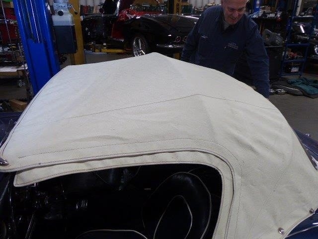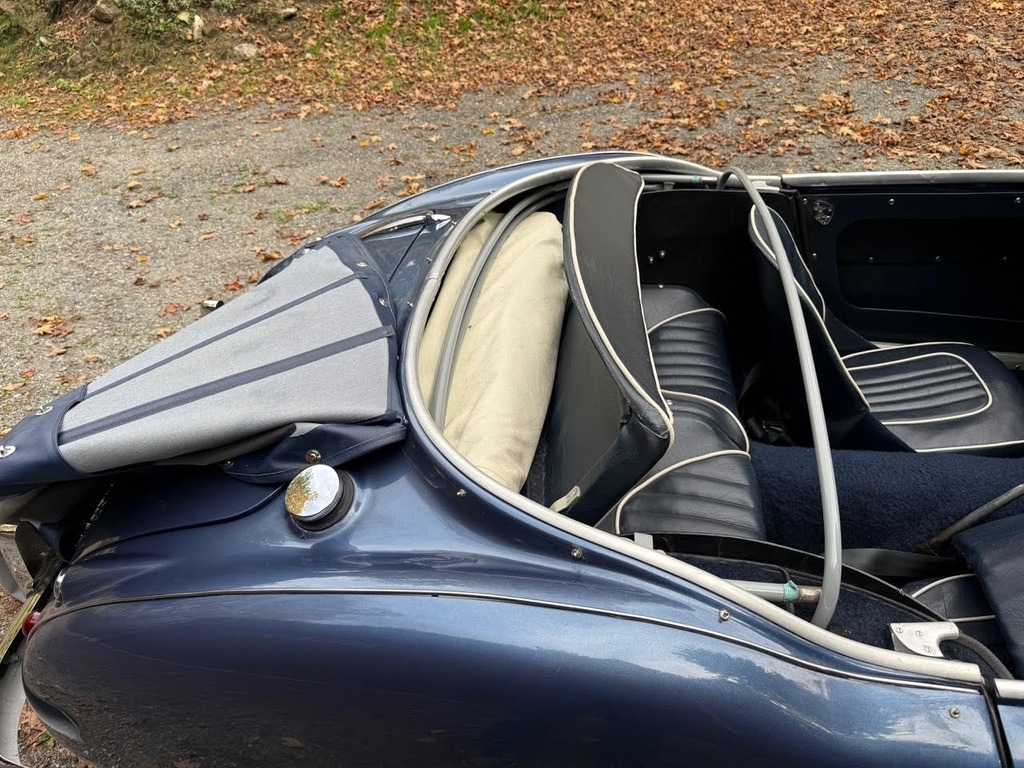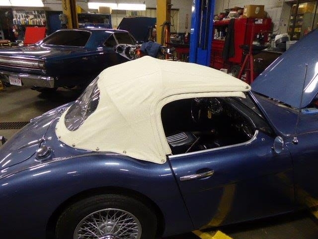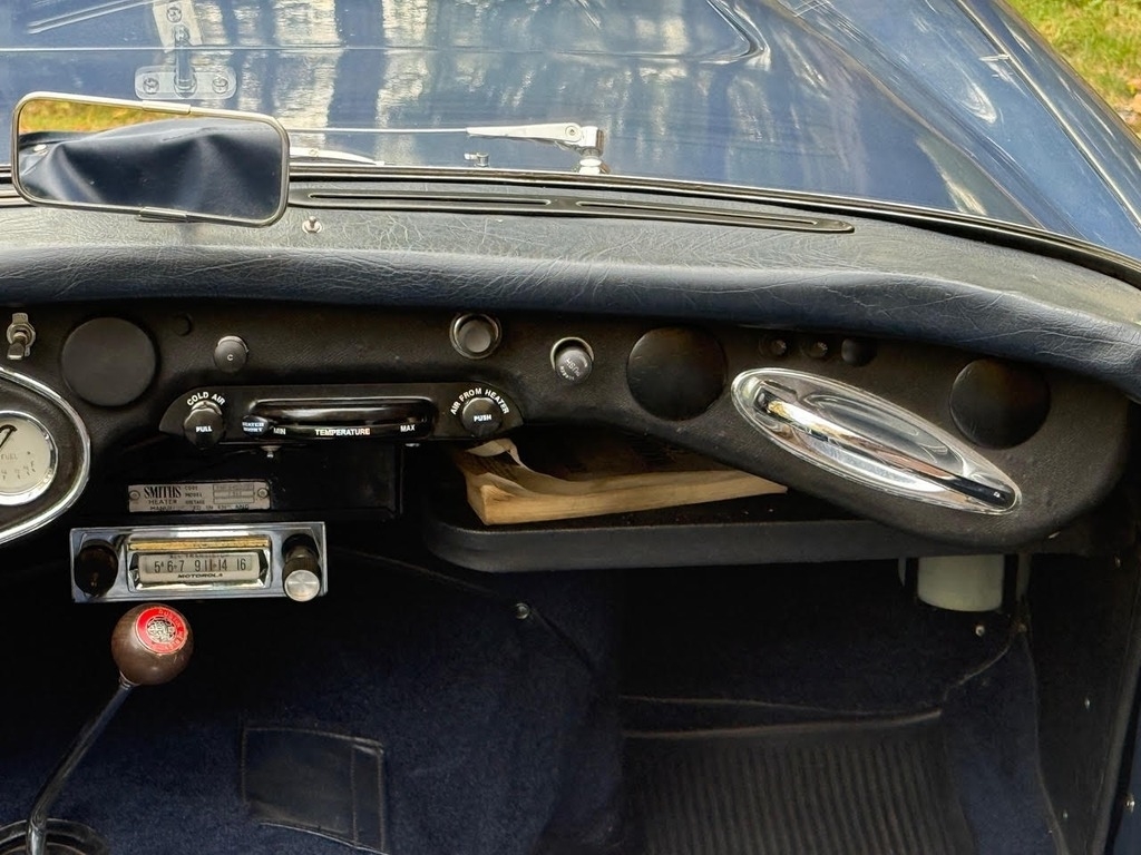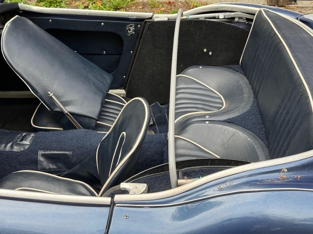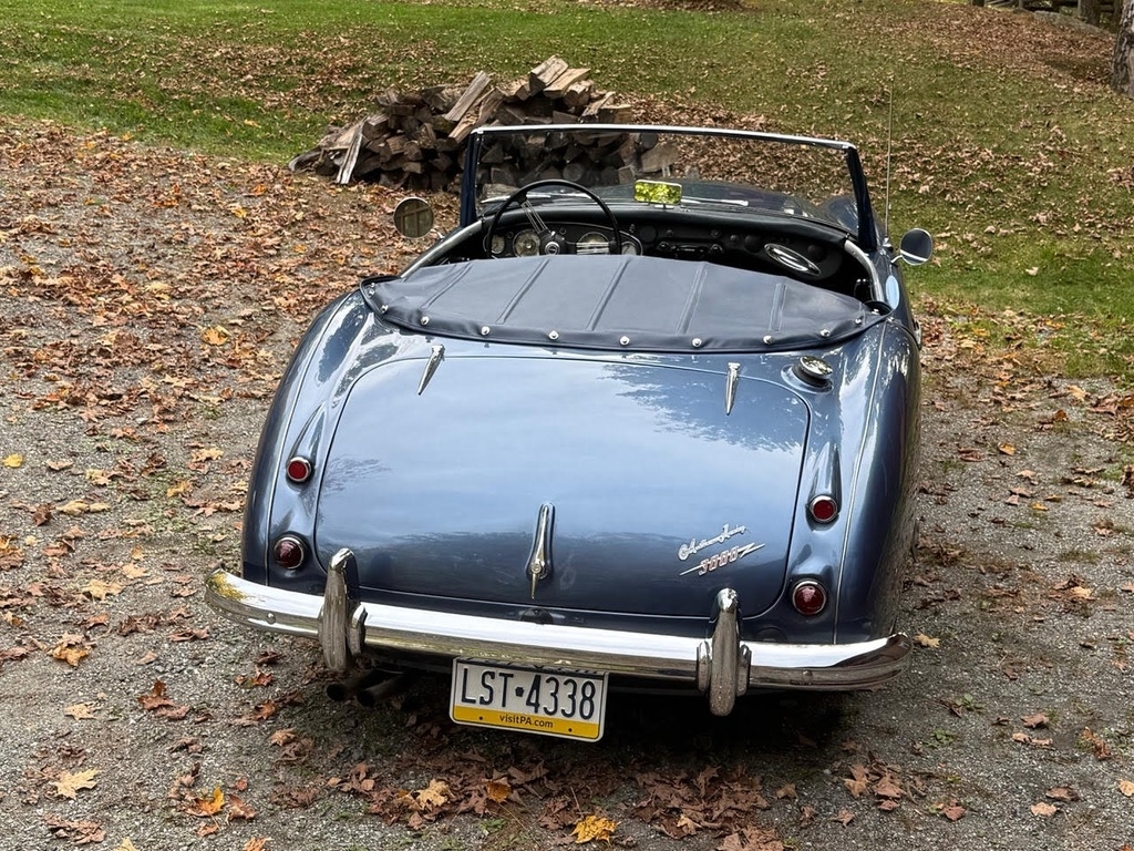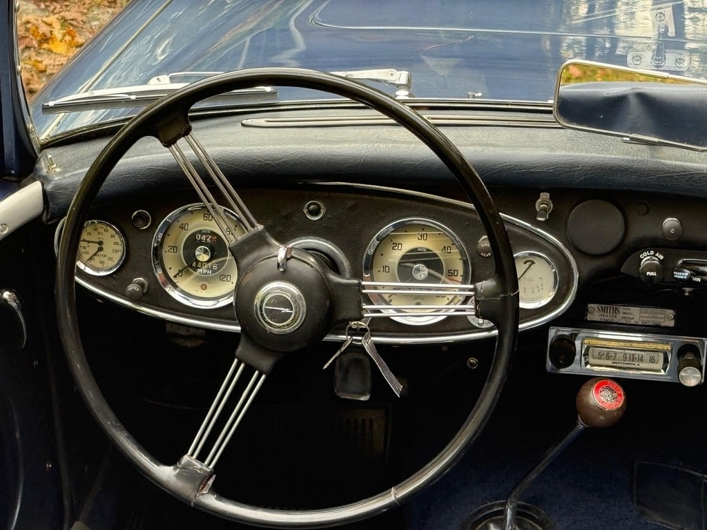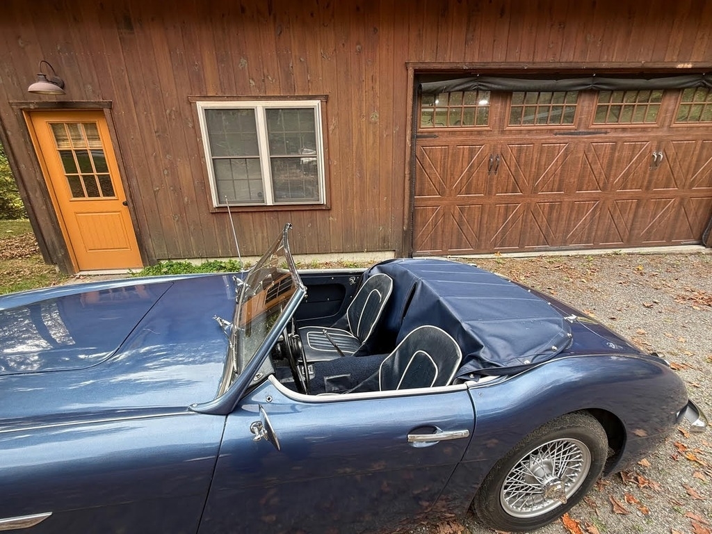 This 1960 Austin-Healey 3000 Mk I BN7 is a beautifully maintained example with a well-documented history and extensive recent mechanical restoration. Originally bought new in Nebraska, it has had only three owners before the current seller and comes with paperwork supporting its past restoration work, including an older repaint in a Grey-Blue finish (not an original Healey color). The car was purchased from a dealer in Sioux Falls, South Dakota and professionally transported to Great Barrington, MA, where Donovan Motorcar Service performed a comprehensive six-month mechanical restoration. Work included replacing rear axle seals, brake shoes, rear brake hose, brake master cylinder, ignition coil, choke, heater valve, oil pressure hose, generator belt, air cleaners, front brake rotors and calipers, front wheel bearings, valve cover gasket, gearbox and engine mounts, hubs, and installing new front springs. Additional major improvements include tuning the carburetors, overhauling the transmission through a specialist, fitting a new top frame and top, repairing the handbrake assembly and throttle pedal spring, installing a new aluminum radiator, stainless-steel exhaust system, fuel pump, heater box with new seals, and replacing the side curtains. The car received an oil and filter change less than 500 miles ago, and all receipts and invoices are preserved in a detailed history package. Always garaged and carefully cared for, this Healey shows consistent maintenance both from previous owners and under current ownership, making it a strong, well-sorted example with significant mechanical investment already completed.
