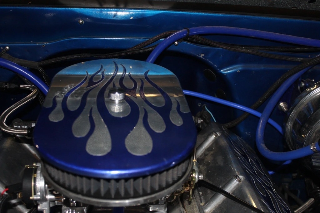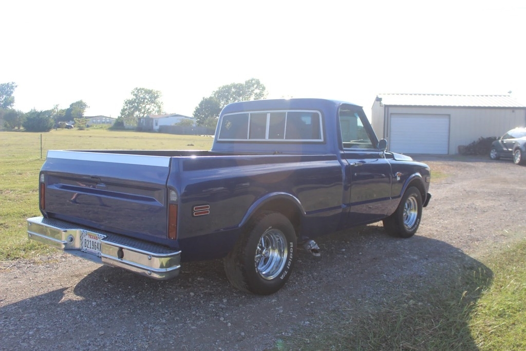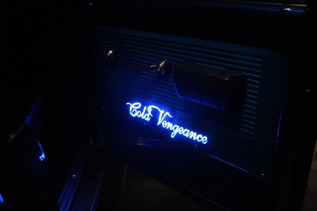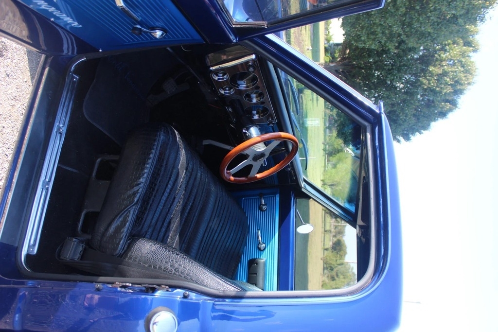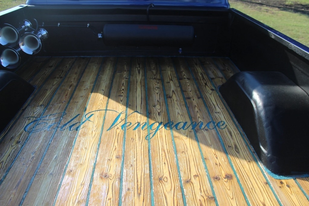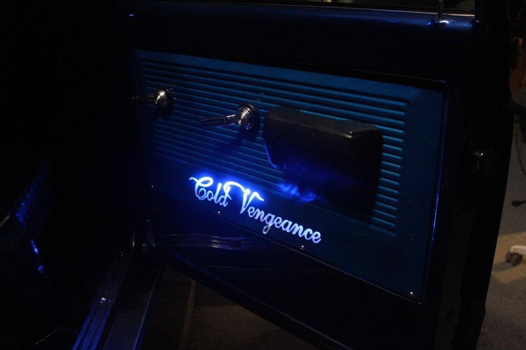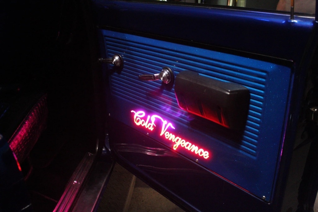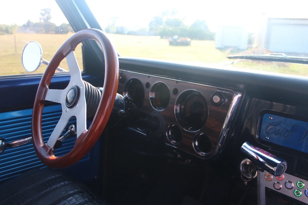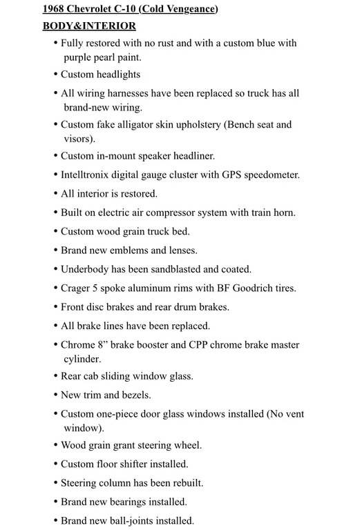 This 1968 Chevrolet C-10 (“Cold Vengeance”) is a fully restored, highly customized classic truck with extensive body, interior, chassis, and drivetrain work detailed in the listing. The body and interior are described as fully restored with no rust and finished in a custom blue with purple pearl paint, along with custom headlights. The truck has had all wiring harnesses replaced, resulting in brand-new wiring throughout. Interior upgrades include custom fake alligator skin upholstery (bench seat and visors), a custom in-mount speaker headliner, an Intellitronix digital gauge cluster with GPS speedometer, restored interior components, and a subwoofer system under the seat. It is built on an electric air compressor system with a train horn, includes a custom wood grain bed, new emblems and lenses, and the underbody has been sandblasted and coated. Rolling stock includes Cragar 5-spoke aluminum rims with BF Goodrich tires. The braking system is upgraded with front disc brakes and rear drums, all new brake lines, a chrome 8-inch brake booster, and a CPP chrome master cylinder. Additional details include a rear cab sliding window, new trim and bezels, custom one-piece door glass windows (no vent windows), a wood grain Grant steering wheel, a custom floor shifter, rebuilt steering column, new bearings, new ball joints, and a wideband fuel/air ratio gauge. The listing notes it has been garage kept.
