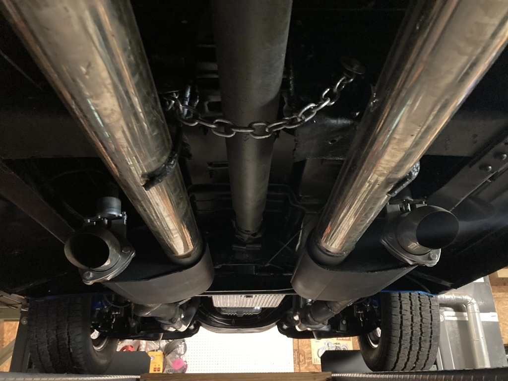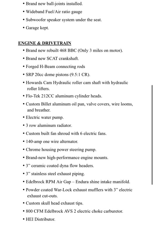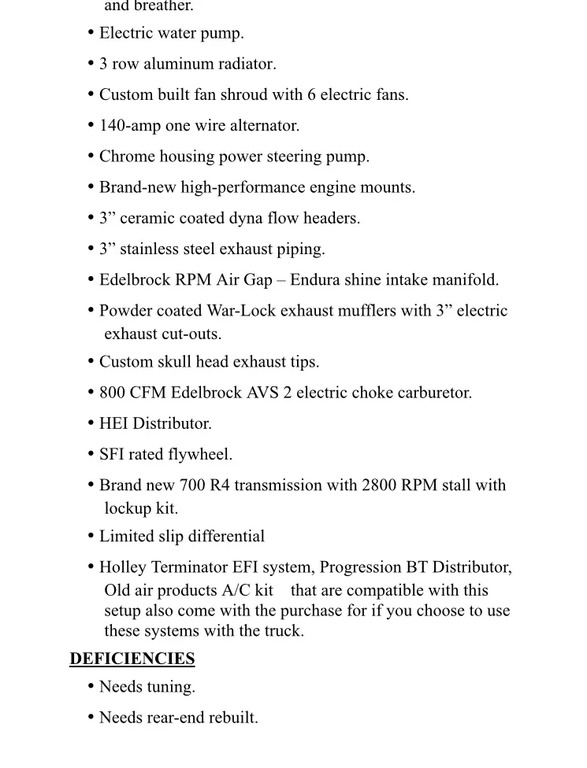 Engine and drivetrain details are extensive: it has a brand new rebuilt 468 BBC (listed as only 3 miles on the motor), a new SCAT crankshaft, forged H-beam rods, SRP 20cc dome pistons (9.5:1 compression), a Howards hydraulic roller cam with hydraulic roller lifters, Flo-Tek 212cc aluminum cylinder heads, and custom billet aluminum oil pan/valve covers/wire looms/breather. It includes an electric water pump, a 3-row aluminum radiator, a custom fan shroud with six electric fans, a 140-amp one-wire alternator, and chrome housing power steering pump. Additional performance items include brand-new high-performance engine mounts, ceramic-coated headers, stainless exhaust piping, Edelbrock RPM Air Gap intake (EnduraShine), powder-coated War-Lock mufflers with three electric exhaust cut-outs, custom skull exhaust tips, an 800 CFM Edelbrock AVS2 carb with manual choke, HEI distributor, and an SFI-rated flywheel. The truck has a brand new 700R4 transmission with a 2800 RPM stall and lockup kit, limited slip differential, and the listing notes a Holley Terminator EFI system, Progression BT distributor, and Old Air Products A/C kit are compatible and included with the purchase if the buyer chooses to use them. Deficiencies noted: it needs tuning and needs the rear-end rebuilt. The listing also notes cash offers only and a clean title.
