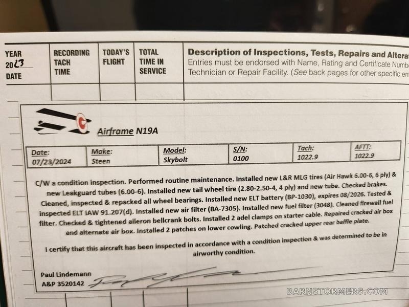 A well-sorted biplane featuring a Lycoming IO-360-A2B (approx. 539 hrs SMOH by Penn-Yan Aero), inverted oil and fuel systems, fuel injection, single-place canopy, 32-gal main tank plus 5-gal smoke tank (uninstalled), Becker radio, and transponder (inop). Ceconite covering appears original; recent maintenance includes new bungees (≈2 yrs) and new 6.00 tires (7/24). ~1,044 TTAF/TT, flown regularly, and offered by an owner upgrading—fun, aerobatic-capable, and ready for its next caretaker. Located in Fargo, ND 58103 For more information, please call 833-265-6113 and mention ID 17231