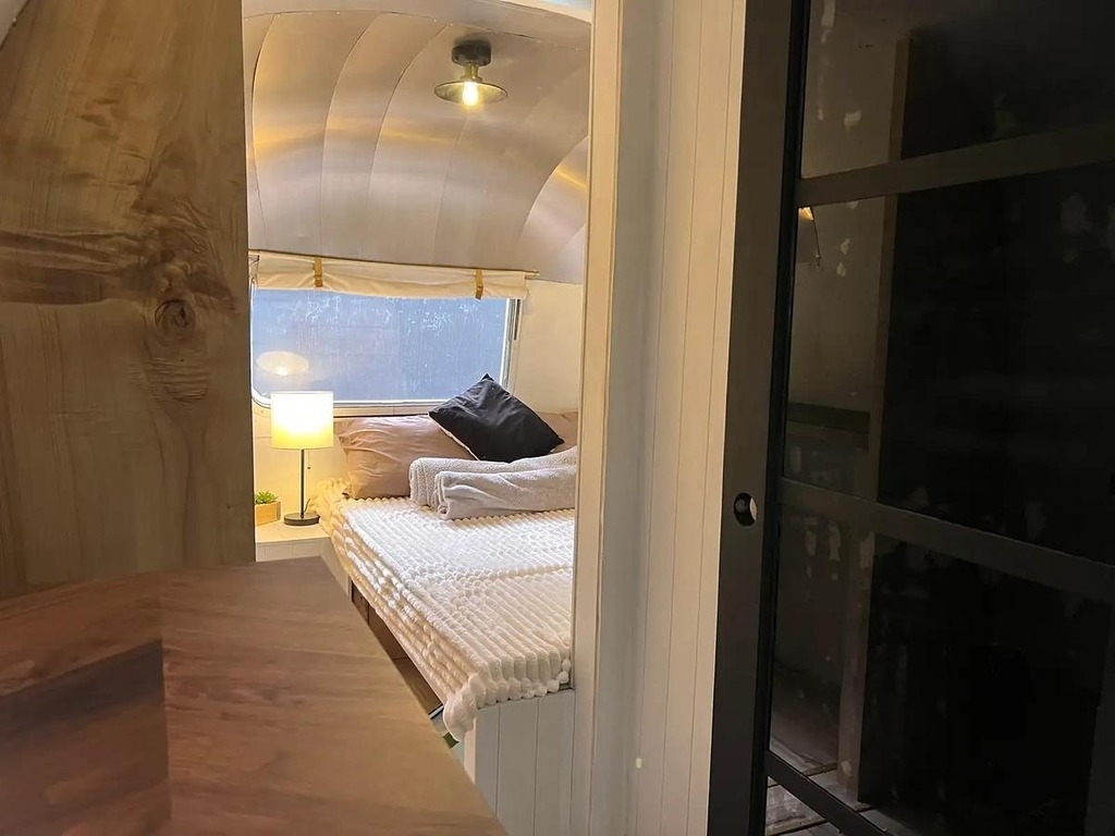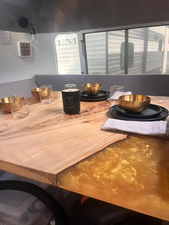 1977 Airstream Excella 500 This custom-rebuilt 1977 Airstream Excella 500 has been stripped down to the frame and shell and thoughtfully redesigned with modern style and functionality while preserving its iconic aluminum silhouette. The trailer now weighs 7,584 lbs, allowing it to be towed with a 1/2-ton truck (down from the original 8,400 lbs), and runs on a 12/120v 30-amp shore power system. It features a stage 2 exterior polish, dual awnings, rock shield, and a cozy tiny wood stove for year-round comfort. Inside, luxury touches include a live edge white oak epoxy dining table that automatically folds into a bed, butcher block countertops, black and gold fixtures, shiplap walling, LED lighting, two MaxxAir roof vents, a skylight, and a brand-new Dometic roof A/C with heat option. The front sleeping area measures 6’4” x 6’8”, large enough for 3 adults or 4 kids, while the rear cabin sleeps 2 with under-bed storage and matching oak paneling. The kitchen includes a propane oven/stove/broiler, black sink with gold faucet, and a Dometic fridge/freezer that runs on electric or propane. The spa-style bathroom features a walk-in shower with rainfall head and bench, marble surfaces, new dry flush toilet, ventilation window, and a reclaimed 70’s glass barn-door entrance. Additional highlights include aluminum interior end caps, dual front batteries, polished 40 lb aluminum propane tanks, custom fridge vent, blackout switches, and a 2-5/16” hitch rated to 9,000 lbs. A wider and taller Excella model, beautifully modernized and ready to live, travel, or Airbnb. Located in Waterloo, ON, Canada N2L 2C9 For more information, please call 833-265-6113 and mention ID 20984
