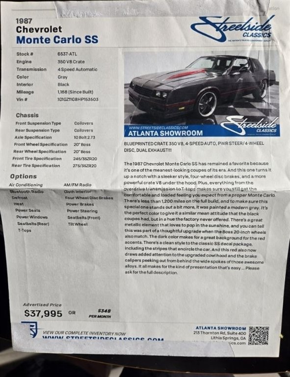 This beautifully restored 1987 Chevrolet Monte Carlo SS has been upgraded for both performance and presence, featuring a 350 cubic inch 5.7L V8 installed in place of the original 305 and paired with a 3200-stall high-speed torque converter for crisp acceleration. The interior has been completely reupholstered with black velour seats and crushed carpet, giving the cabin a fresh, clean finish. The AC blows cold, and all weather stripping—including the T-tops—was replaced less than two years ago. Located in Naples, Florida, this Monte Carlo is a true head-turner, often parked right up front in valet alongside Lamborghinis, Ferraris, and McLarens—always stealing the show. It also features a Dakota Digital dash, and although the actual mileage is unknown, the car runs strong and presents in exceptional condition.