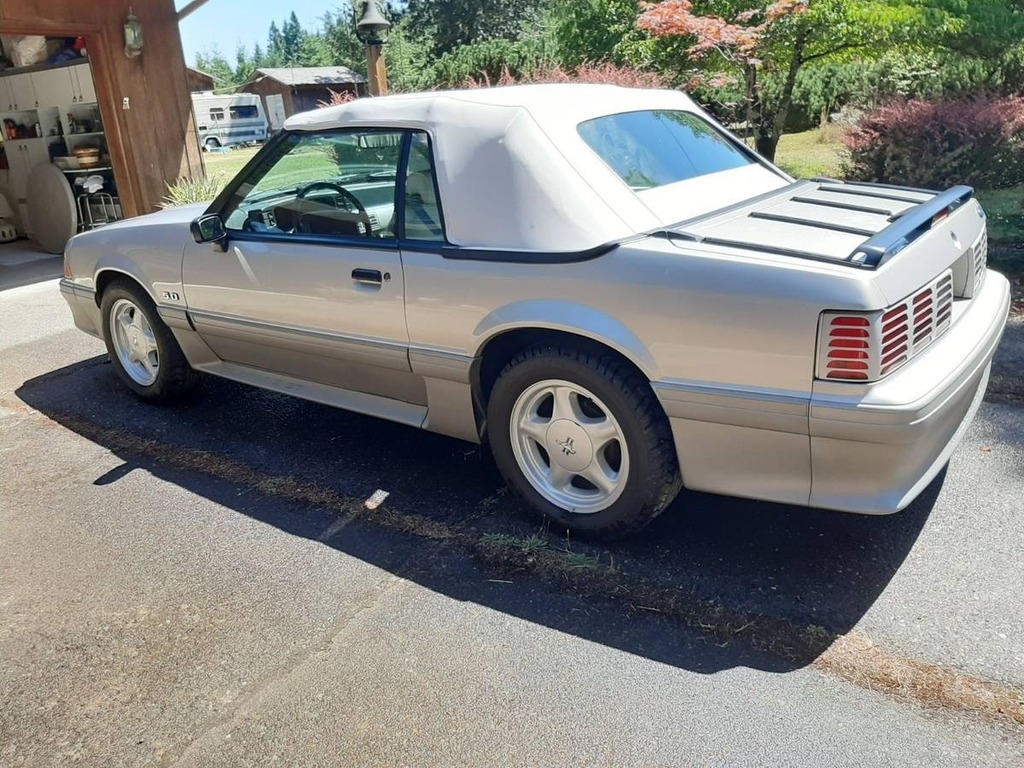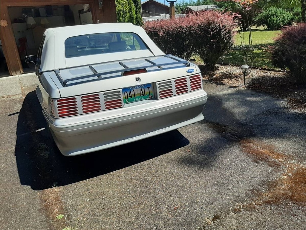 1992 Ford Mustang GT 5.0 Convertible, a true Fox Body classic that represents an iconic era of American muscle cars. This Mustang is in immaculate, like-new condition and has been meticulously maintained by its original, single owner. With just 52,050 original miles on the odometer, it offers a rare opportunity to own a piece of automotive history in exceptional shape. The sleek silver exterior perfectly complements the all-white leather interior, creating a sharp and timeless aesthetic that stands out on the road. This car has always been pampered—garaged and covered at all times to protect it from the elements, and the owner has been a non-smoker with no pets ever inside, ensuring the interior is as pristine as the day it rolled off the lot.