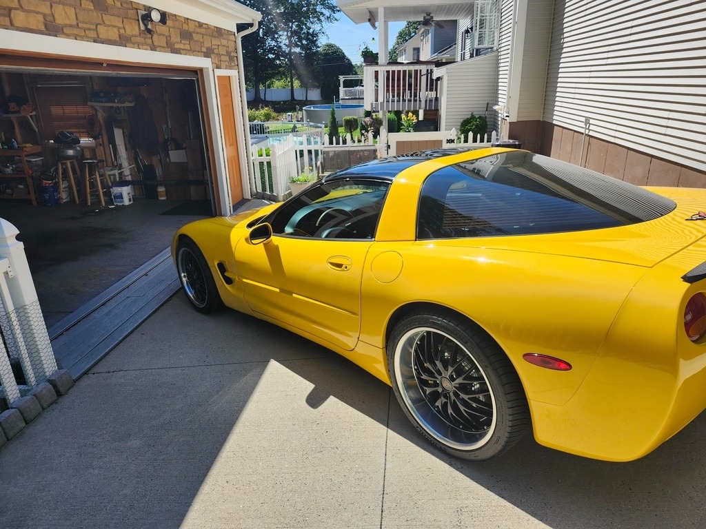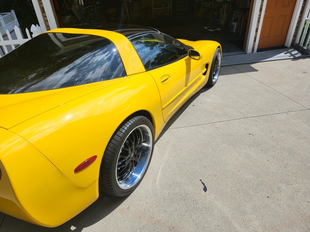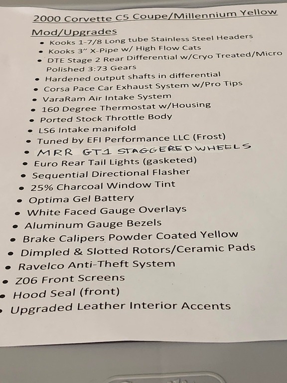 2000 Chevrolet Corvette C5 Coupe in Millennium Yellow with only 49,150 original miles. This fully loaded Corvette features an automatic transmission, Heads-Up Display, and a clean title with no accident history, making it an exceptional find. The car comes with both the original yellow top and a glass see-through top, offering a versatile driving experience. It rides on sleek 20-inch staggered MMR GT1 wheels wrapped in newer all-season Michelin tires, enhancing its aggressive stance and handling. This C5 has been professionally modified for performance, including Kooks long tube stainless steel headers, a Kooks 3” X-Pipe with high flow cats, a DTE Stage 2 rear differential with polished 3:73 gears, and a Corsa Pace Car exhaust system with Pro Tips for an exhilarating sound.