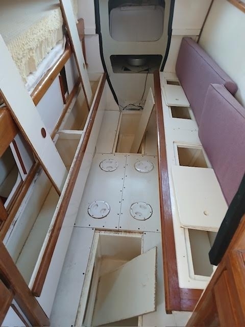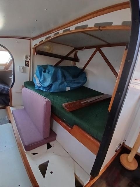 Powered by two Yamaha 9.9 engines, this catamaran features a rotating wing mast and a single daggerboard for excellent sailing performance. It includes two full-sized berths and additional space for one in the V berth, along with ample storage for a boat of this size.