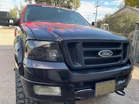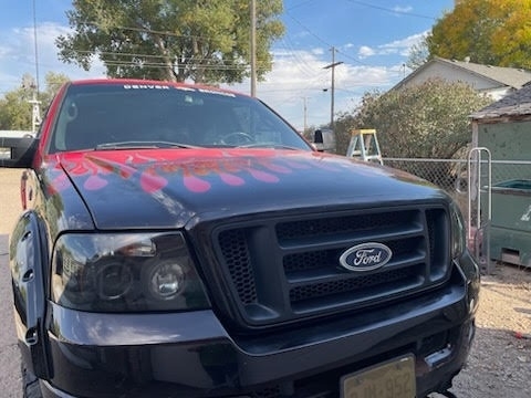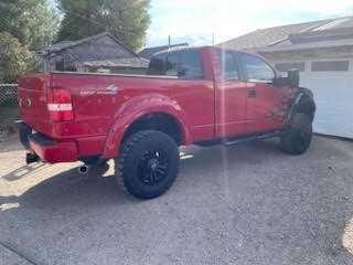 This 2005 Ford F-150 is a bold and customized pickup that stands out with its striking red and black exterior accented by flame graphics. Built for both style and performance, it features aggressive off-road tires, black alloy wheels, and fender flares that add to its rugged appeal. The extended cab design provides extra interior space, making it practical for work or play. Strong, reliable, and visually distinctive, this F-150 is an eye-catching truck that’s ready for the road or off-road adventures.