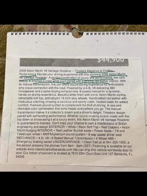Experience the epitome of luxury and performance with the 2008 Aston Martin Vantage V8 Roadster. This exquisite vehicle is engineered with precision, featuring a robust 4.3-liter V8 engine that delivers impressive horsepower, ensuring a thrilling driving experience with every touch of the accelerator. Paired with a smooth six-speed manual transmission, the Vantage V8 Roadster offers an engaging drive that enthusiasts will cherish. The exterior design exudes elegance with its sleek and aerodynamic silhouette, while the convertible roof provides the ultimate open-air experience. Inside, the cabin is a sanctuary of comfort and sophistication, crafted with premium leather upholstery and thoughtfully designed controls that are both intuitive and within easy reach. Cutting-edge technology, including an advanced audio system and optional navigation, ensures connectivity and entertainment on the road. Safety features such as stability control, airbags, and anti-lock brakes provide peace of mind. Melding quintessential British style with high-performance dynamics, the 2008 Aston Martin Vantage V8 Roadster is a symbol of automotive excellence.