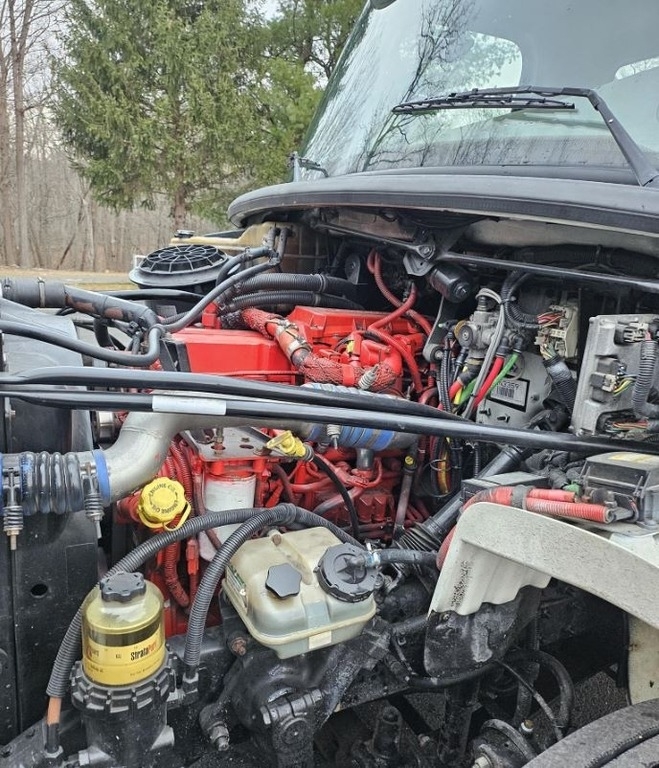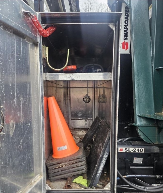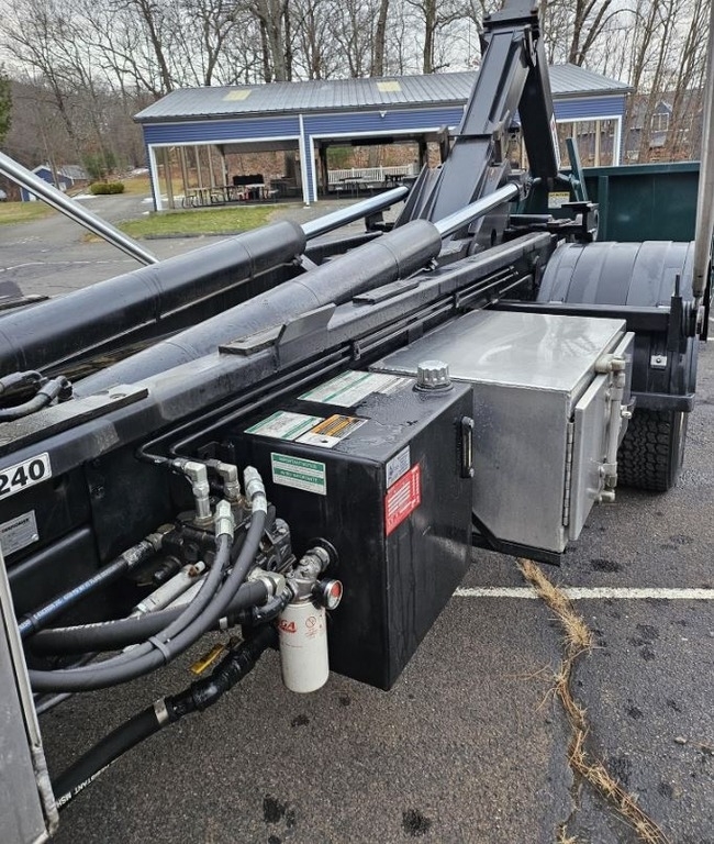 This Freightliner M2 106 hooklift truck is a versatile and professionally outfitted vocational unit featuring a Cummins ISC engine rated at 350 horsepower with an engine brake, paired to a 9-speed Eaton manual transmission. With 147,000 miles and 5,760 hours, this truck received a Swaploader SL 240 hooklift system installed in 2023, rated at 24,000 pounds. It is equipped with an air-shift PTO, electric tarp system, rear pintle plate with 7-pin plug and brake controller, aluminum toolboxes including a custom cross box, and a modern touchscreen radio with backup camera. Additional highlights include power windows, power locks, air seat, A/C in excellent condition, and a locking rear axle. A 15-yard container is included, making this unit immediately usable for waste, construction, or municipal applications.