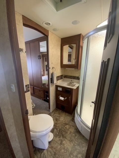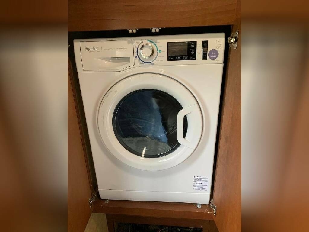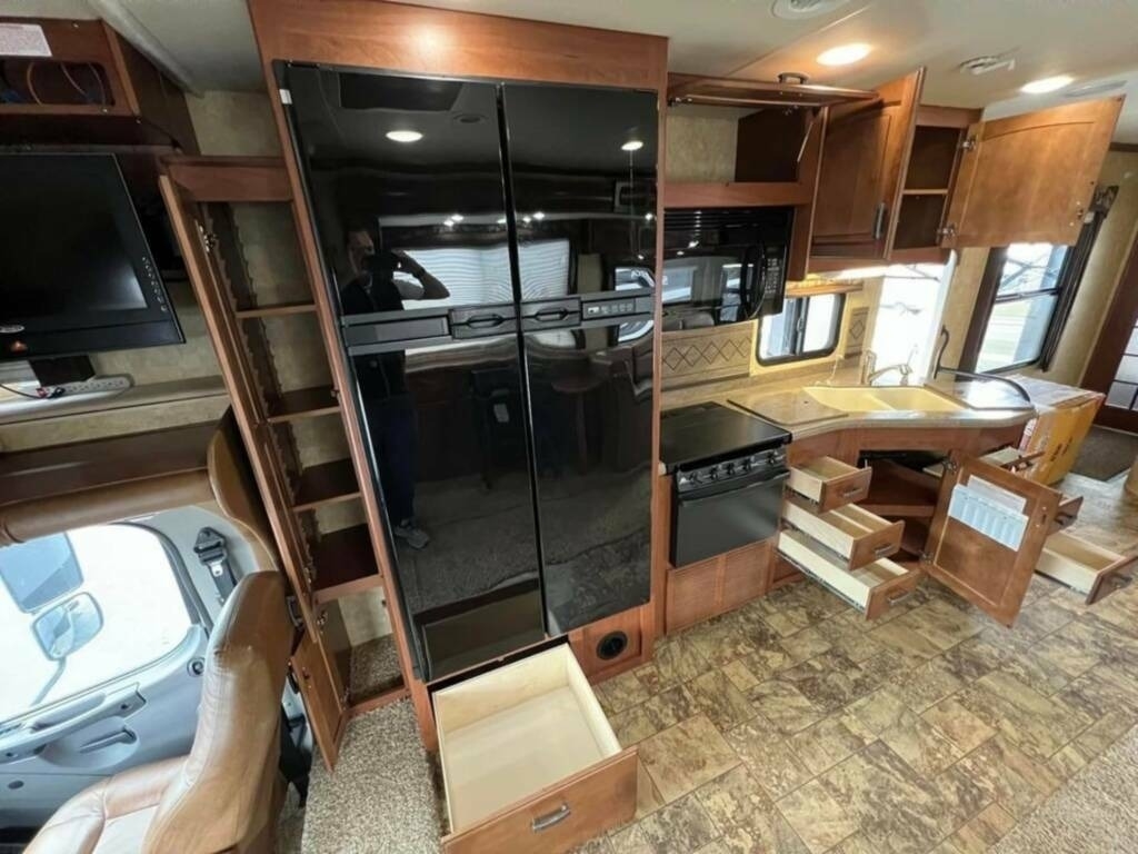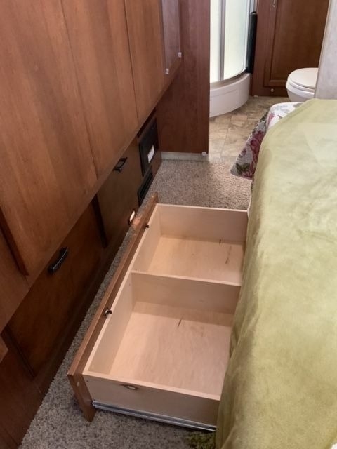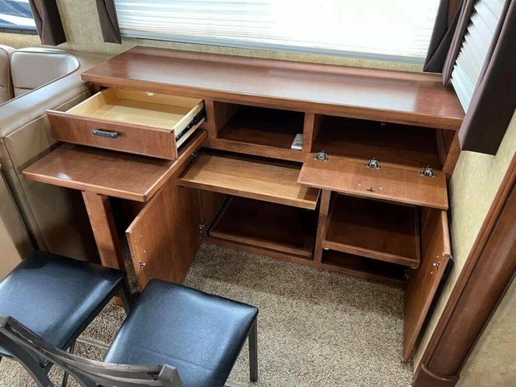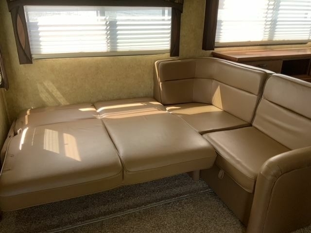 Inside, you'll find plenty of space and all the amenities you need for a comfortable journey. The original dinette has been replaced with a custom desk/dinette with storage and an extendable table, while the couch has been replaced with a Flexsteel L-shaped pullout with a queen sleeper and storage drawer. The bathroom sink and top have been changed to a one-piece unit with more counter space, the bedroom wardrobe sliding doors have been replaced with custom swing-open doors, and the bed base has been modified to include a large drawer at the foot of the bed and accommodate a queen mattress with a Zinus memory foam with cooling properties added.