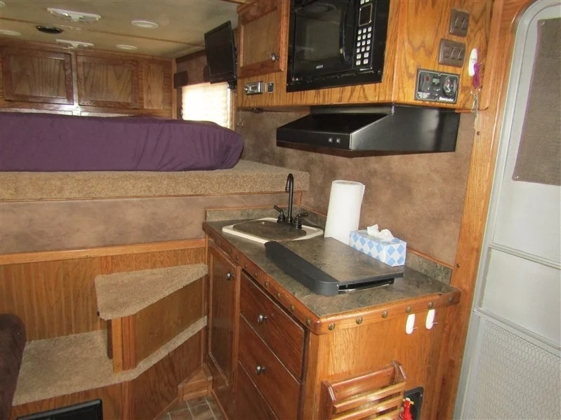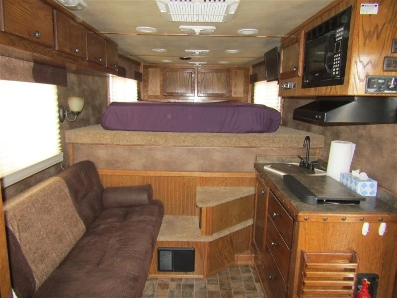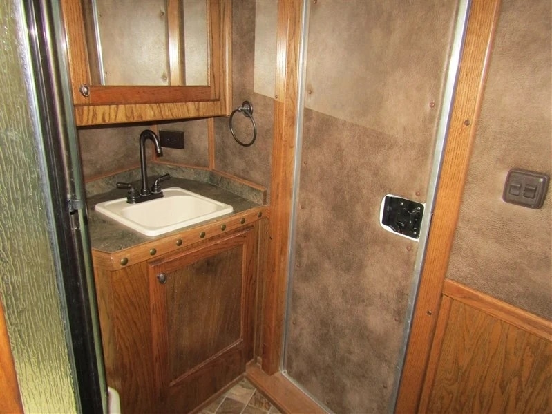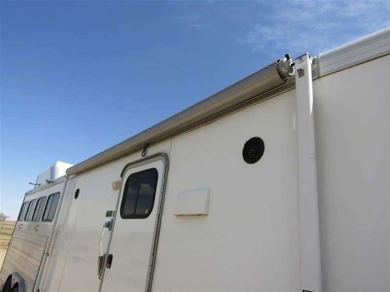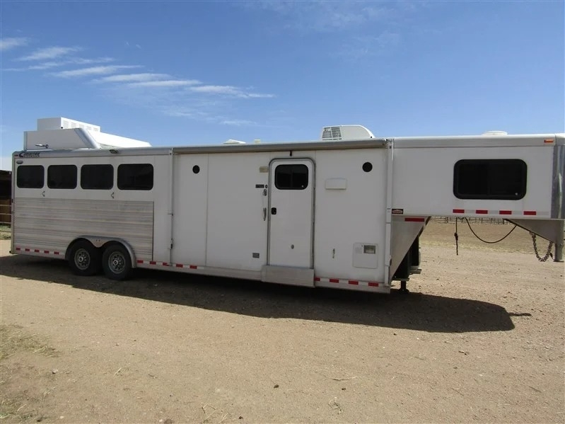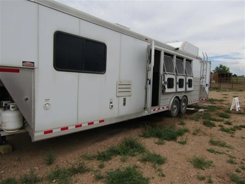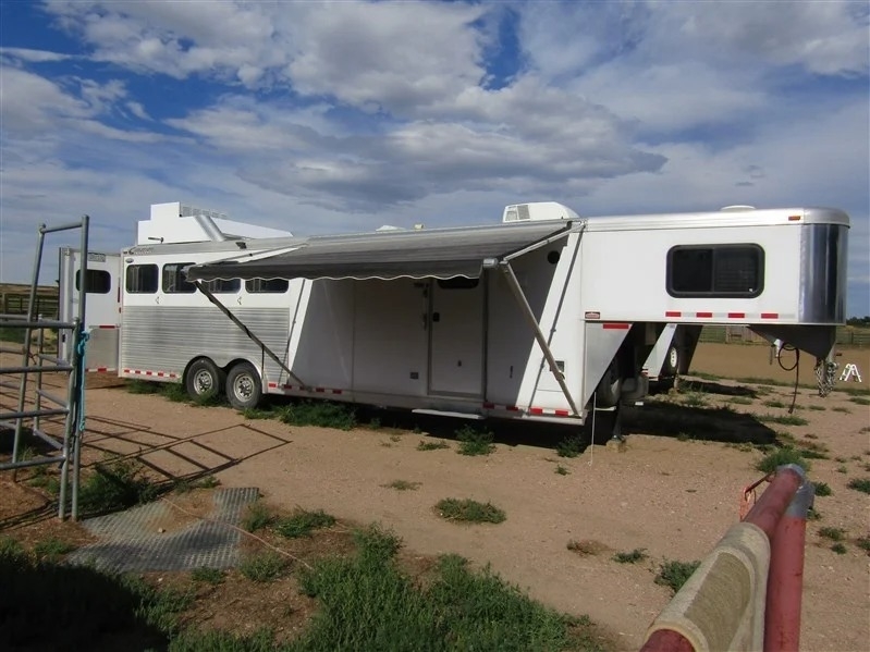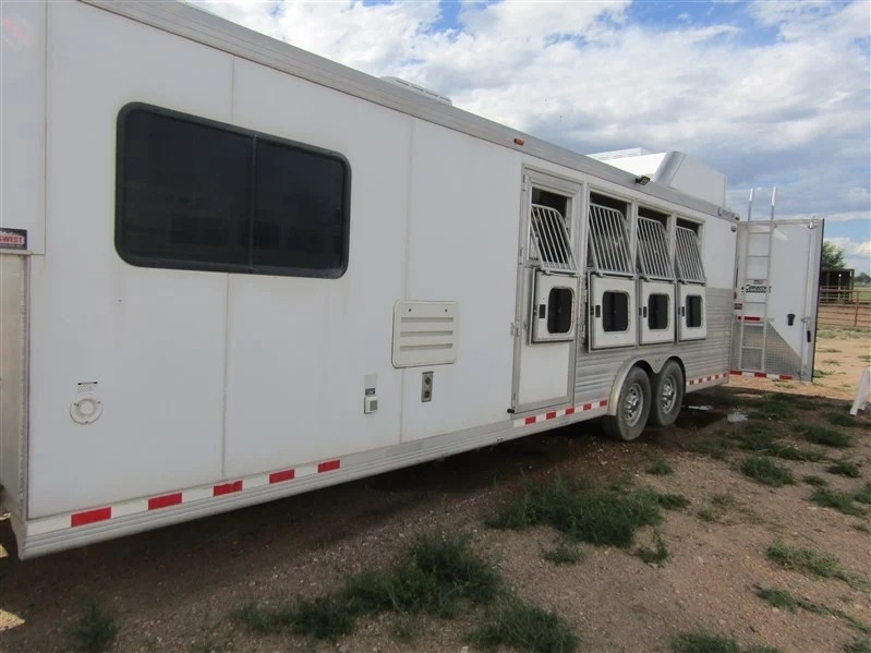 Why spend tens of thousands more on a brand-new trailer when this immaculate 2014 Cimarron 4-horse with living quarters gives you everything you need for way less? Bought new in 2015 and only lightly used—averaging about 5 times a year—it’s a one-owner trailer that’s been well cared for and is totally ready to go. It comes equipped with two brand-new batteries and a roof-mounted generator with just over 130 hours, recently serviced. Inside, you’ve got a large refrigerator, a fold-out couch, TV, radio with outdoor speakers, and a separate toilet and shower setup for convenience. There’s ceiling A/C and a separate heating unit to keep things comfortable no matter the weather. For the horses, it’s set up with drop-down front windows with bars, sliding windows at the rear, and a stud stall with interior access. Exterior perks include a big awning, two easy-access storage compartments under the mangers, a reinforced right rear door, diamond plating on both rear doors, and a handy back tack. Plus, it comes with extras like extension cords, wheel levelers, and blocks. All measurements are approximate, but it’s all packed and ready for your next haul.