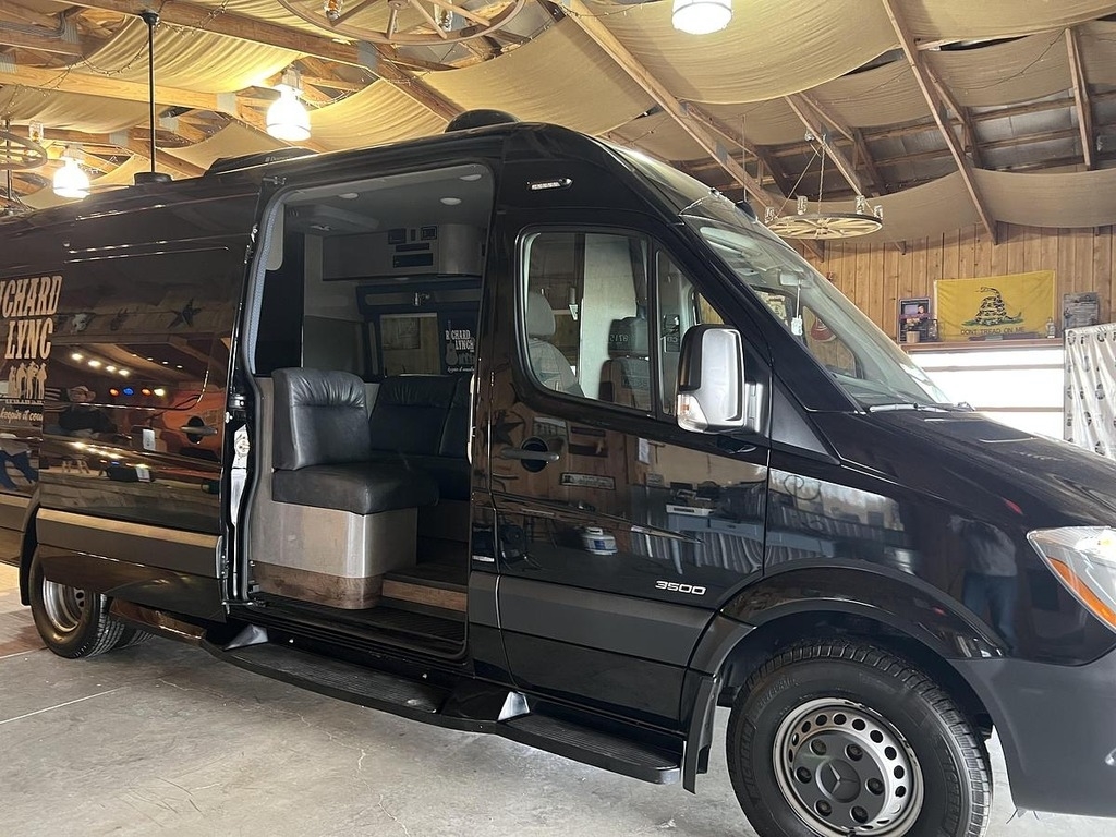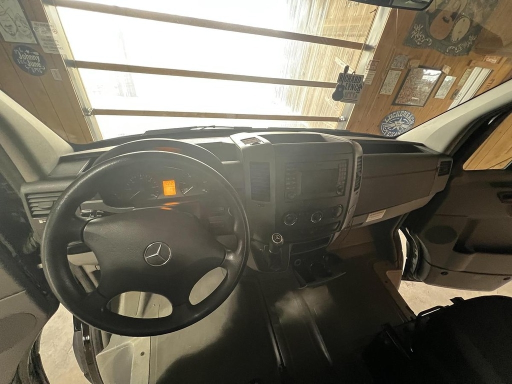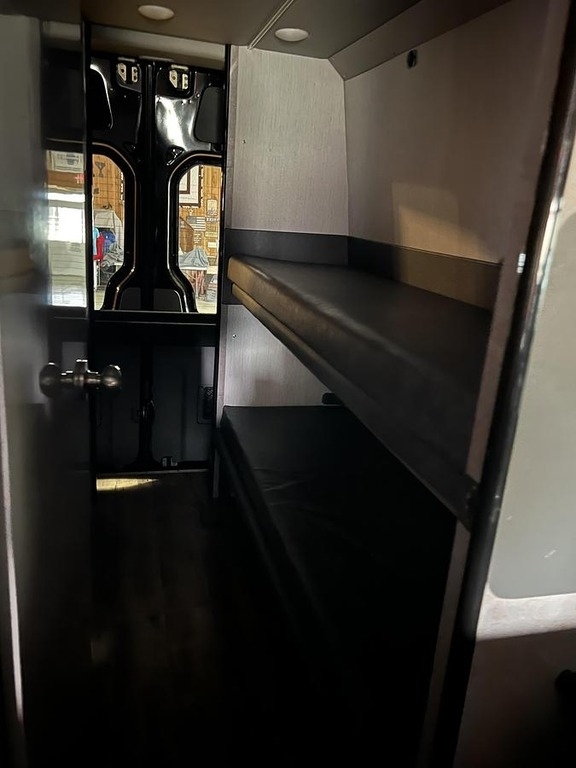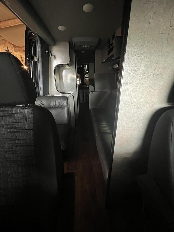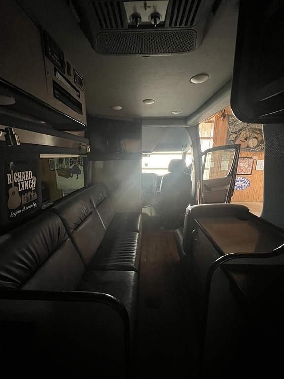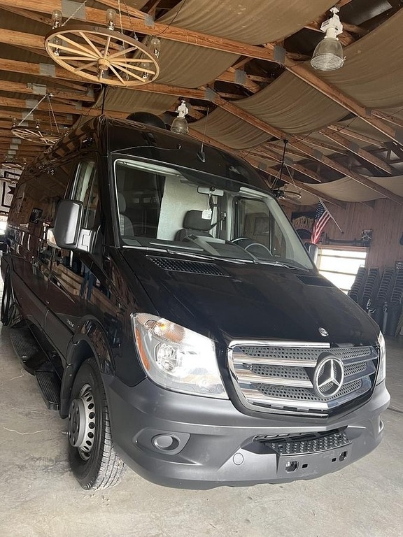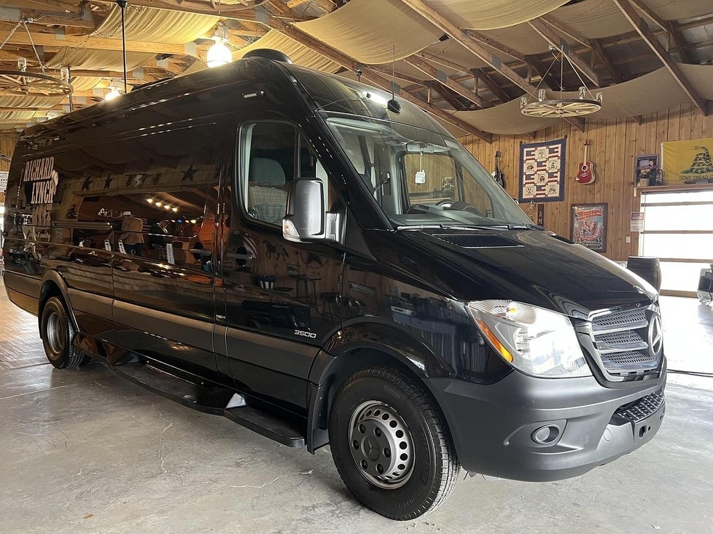 Introducing a remarkable 2015 Mercedes-Benz Sprinter 3500, an entertainer’s coach designed for comfort and utility. This high-roof van features a striking black exterior and has logged 104,410 miles. Under the hood, it boasts a robust 3.0L V6 BlueTEC turbo diesel engine, delivering 188 horsepower paired with a smooth 5-speed automatic transmission. Enhanced with dual rear wheels and a heavy-duty after-market leaf spring suspension, this vehicle is equipped for both performance and stability. Inside, the custom-designed interior by Vulcan Coach of Birmingham, AL, showcases denim blue and gray finishes, complete with overhead and undermounted LED lighting, as well as custom upholstered couches that convert into double bunks. With a total of seven bunks, each equipped with charging ports and individual lamps, privacy curtains, and ample storage, this coach is perfect for group travel. The mid-section features a large sliding side door, vinyl and cloth-covered walls, and a convertible couch, while the kitchen area includes custom cabinetry, a microwave, and space for a mini refrigerator. Additional amenities include driver and passenger airbags, remote keyless entry, cruise control, and an AM/FM radio with Bluetooth connectivity. Located in Lebanon, OH 45036 For more information, please call 833-265-6113 and mention ID 971331