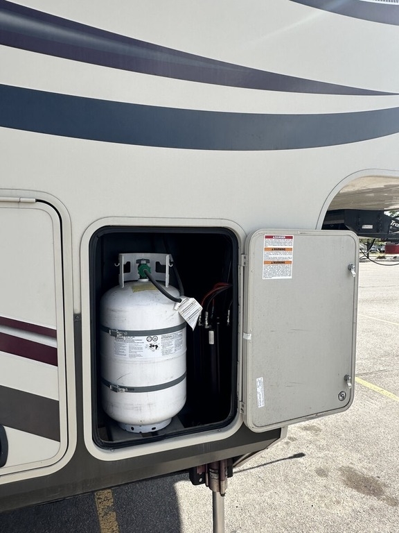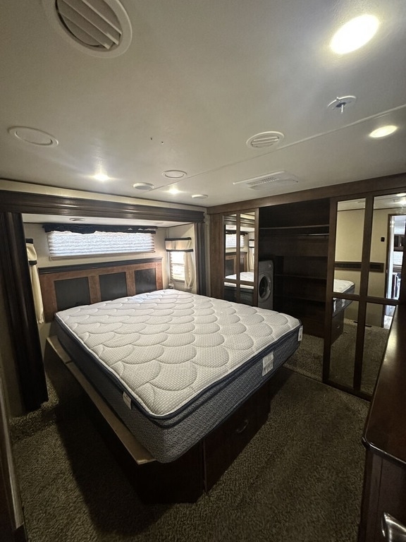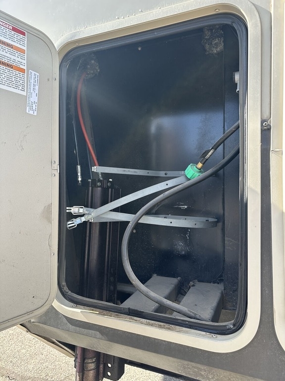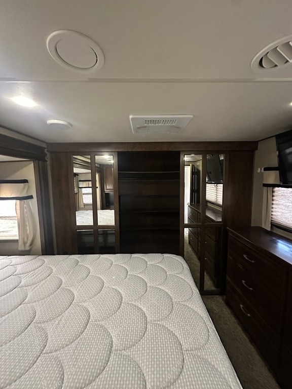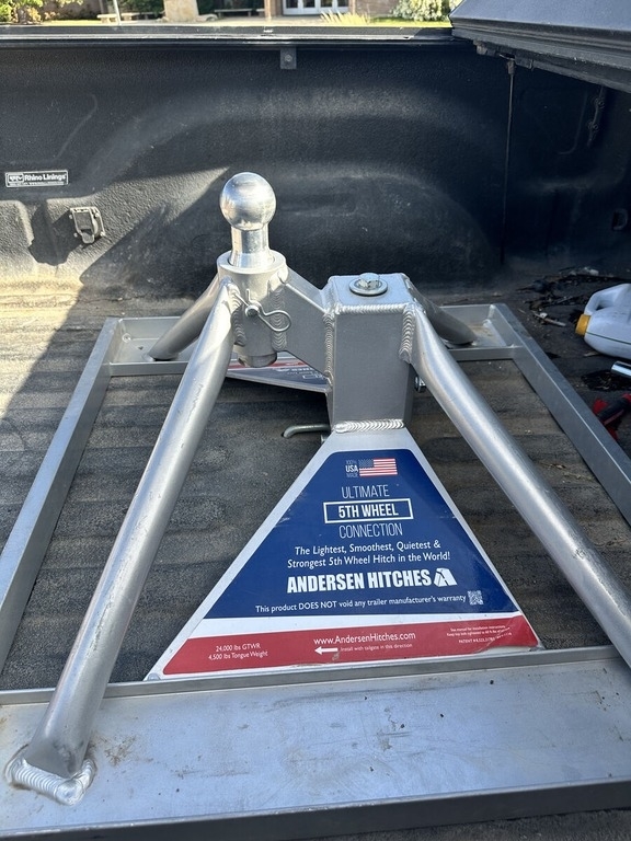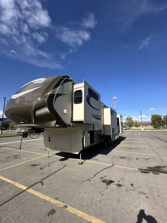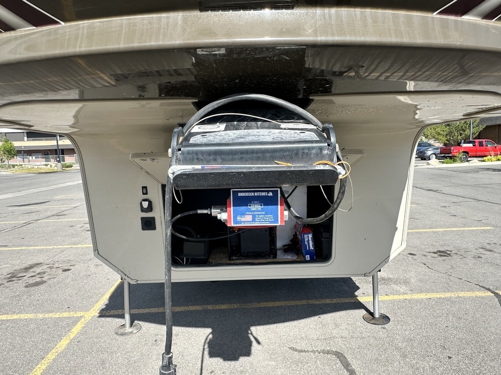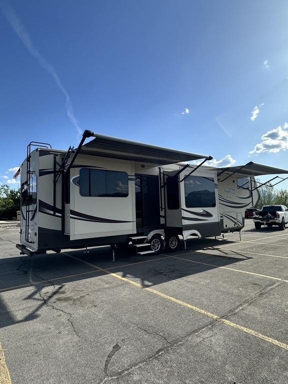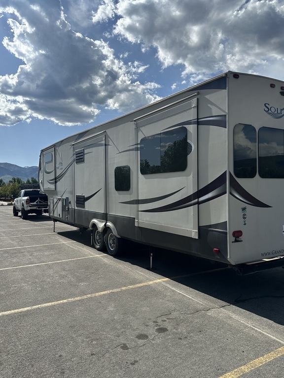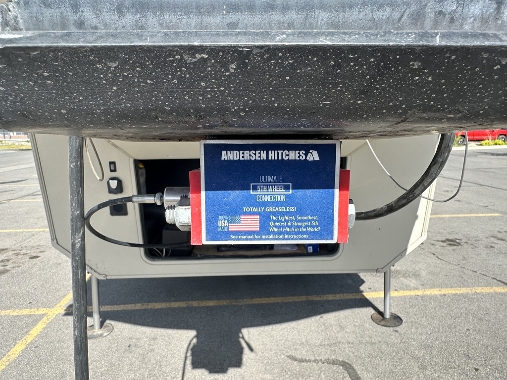 The private master bedroom features a king-size bed and includes a washer and dryer for extended trips or full-time living convenience. The large bathroom offers a roomy shower with skylight, creating a bright and comfortable space. Built with Grand Design’s Weather-Tek insulation package, this Solitude is equipped with a heated and enclosed underbelly, dual air conditioning units, and a high-efficiency furnace to handle a wide range of climates. Exterior features include power awnings, an exterior ladder, large pass-through storage, and a roof and tires that are both in good condition. The unit also comes with an Andersen Ultimate 5th Wheel Hitch along with the power cord and hookup gear, making it ready to tow today. Please note the sliding glass shower door will need replacement, which is a minor cosmetic item. This beautiful and spacious fifth wheel is perfect for extended trips, snowbird travel, or comfortable full-time living.