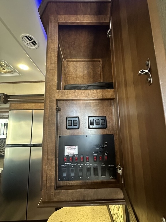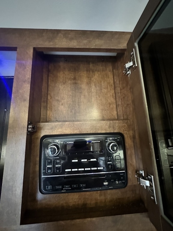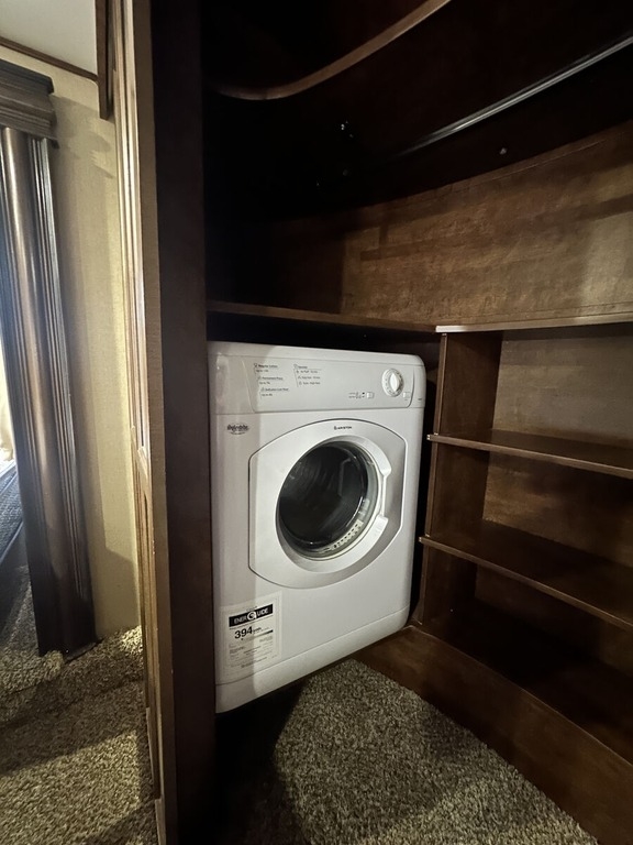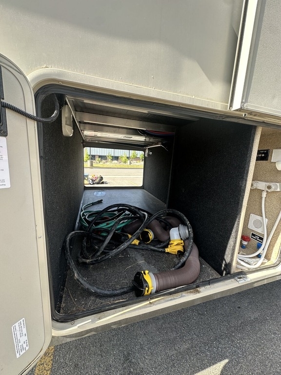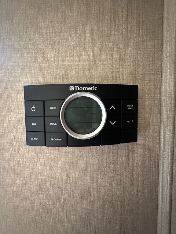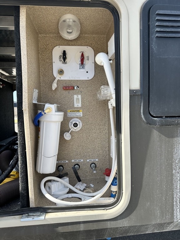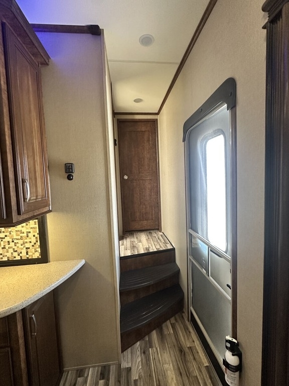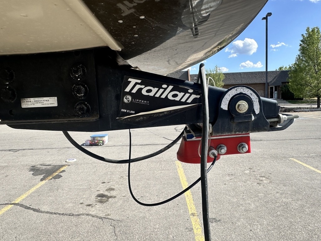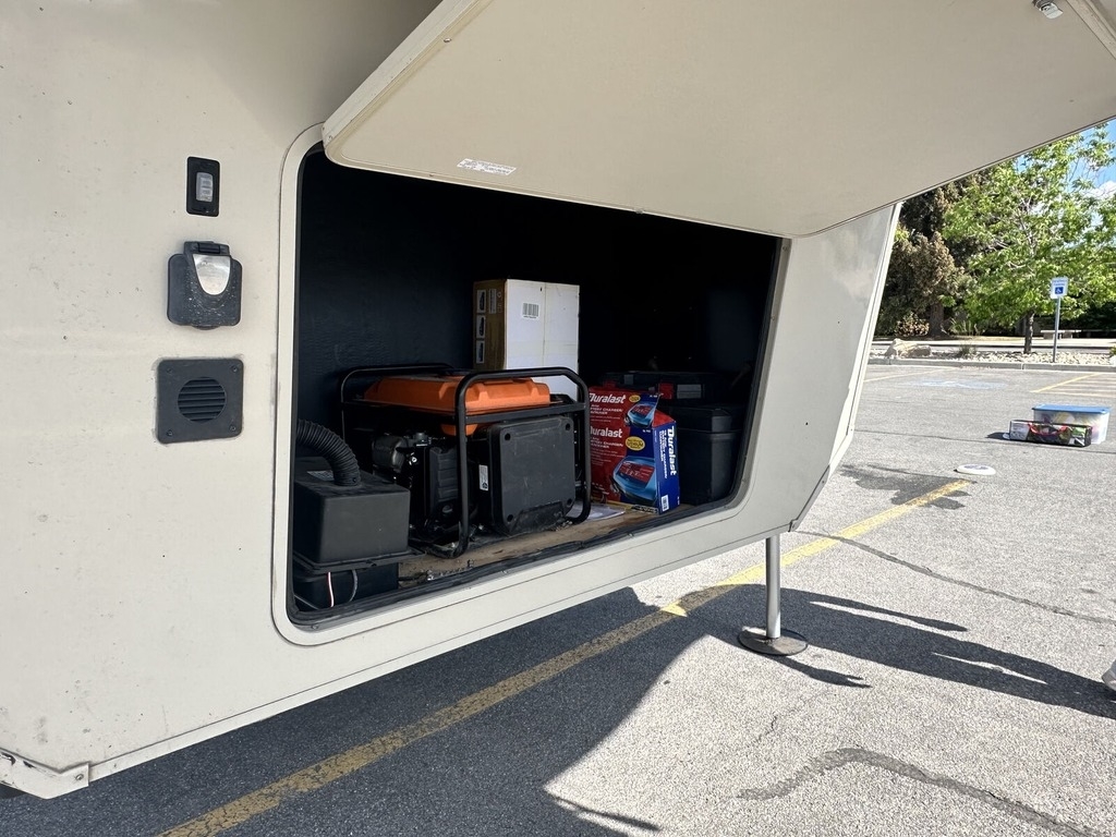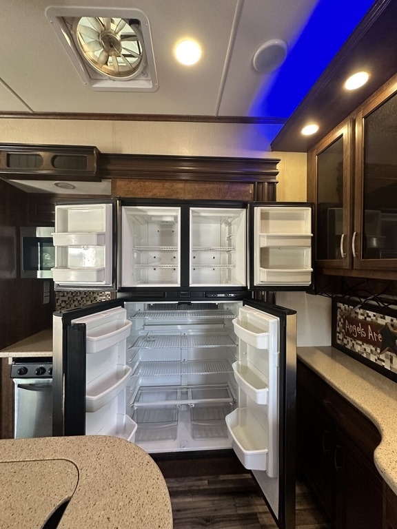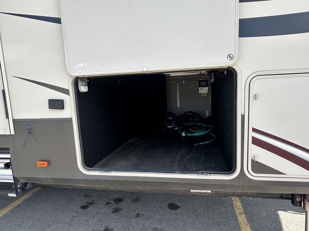 The private master bedroom features a king-size bed and includes a washer and dryer for extended trips or full-time living convenience. The large bathroom offers a roomy shower with skylight, creating a bright and comfortable space. Built with Grand Design’s Weather-Tek insulation package, this Solitude is equipped with a heated and enclosed underbelly, dual air conditioning units, and a high-efficiency furnace to handle a wide range of climates. Exterior features include power awnings, an exterior ladder, large pass-through storage, and a roof and tires that are both in good condition. The unit also comes with an Andersen Ultimate 5th Wheel Hitch along with the power cord and hookup gear, making it ready to tow today. Please note the sliding glass shower door will need replacement, which is a minor cosmetic item. This beautiful and spacious fifth wheel is perfect for extended trips, snowbird travel, or comfortable full-time living.