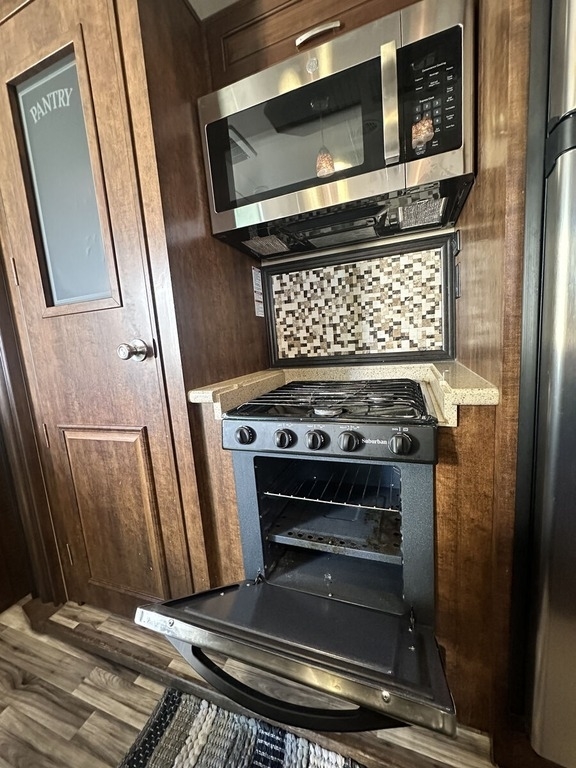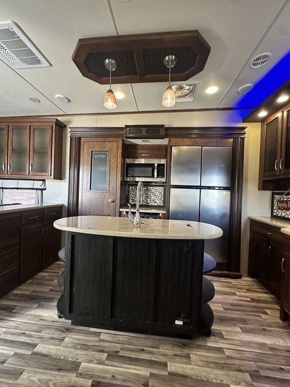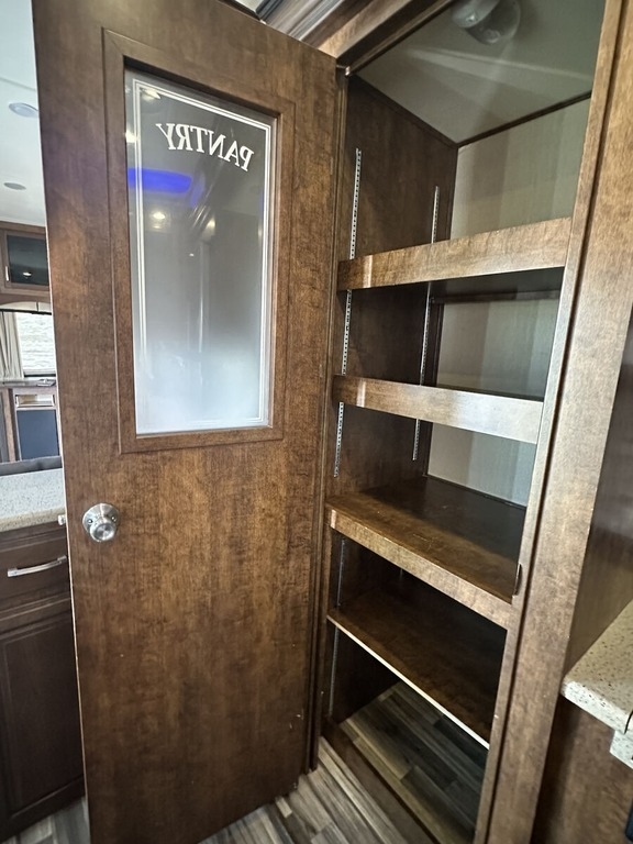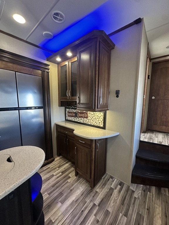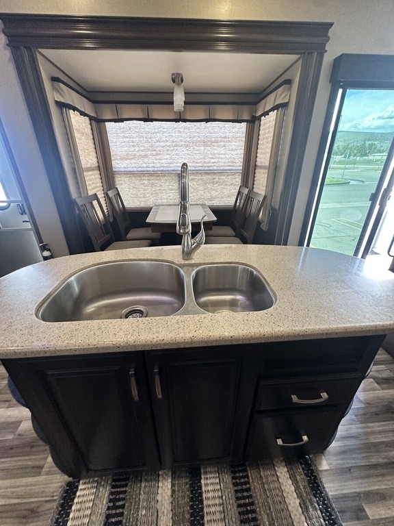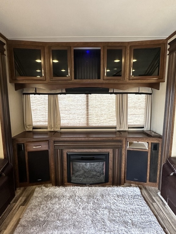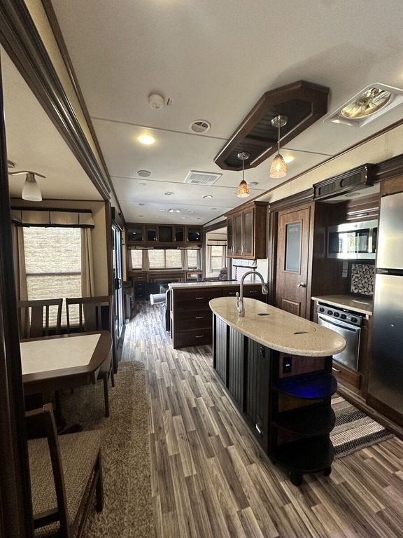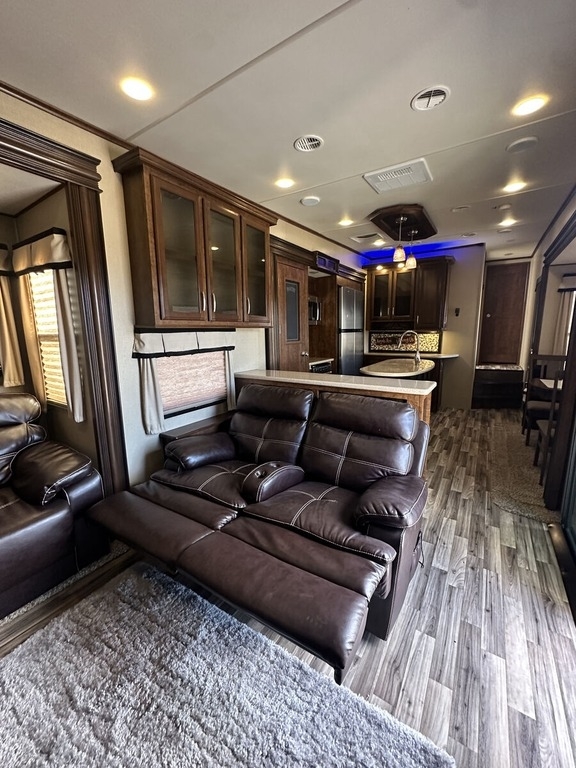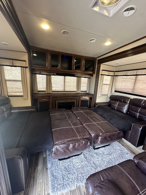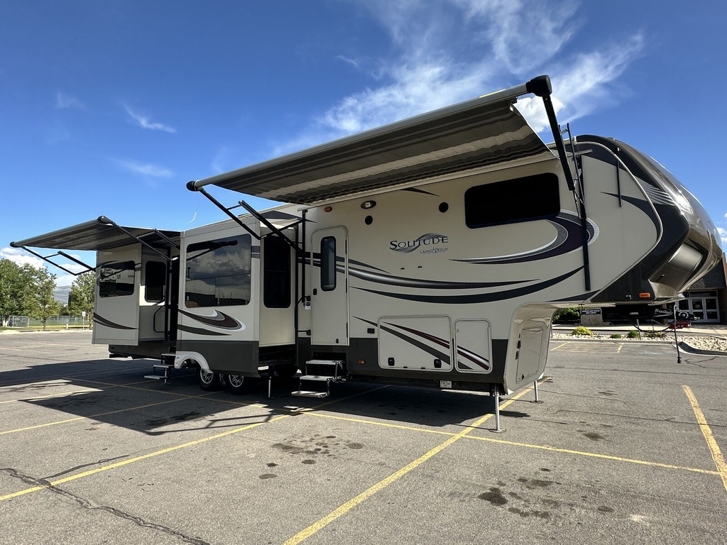 This 2016 Grand Design Solitude 375RE is a very clean, well-maintained luxury fifth wheel designed for residential comfort and true four-season camping capability. Measuring approximately 42 feet in length with five slide-outs, this spacious rear entertainment model comfortably sleeps up to six people and is in excellent condition with everything functioning as it should, ready to hit the road immediately. The rear living layout features a large television and fireplace, theater-style reclining seating, and a sleeper sofa for relaxing or entertaining. Solid wood cabinetry is found throughout the interior, complementing the residential-style kitchen complete with an island, pantry, dining table with chairs, and abundant storage.