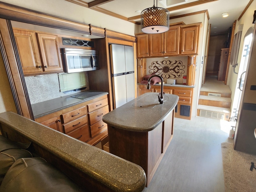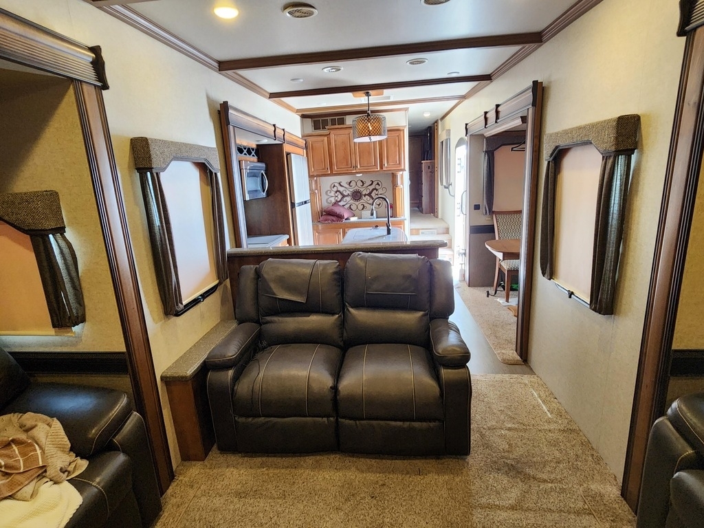 This 2016 Heartland Big Country BC 4010RD Fifth Wheel is a spacious and well-appointed luxury RV designed for extended stays or full-time living. Featuring a wide-open rear den floorplan, it offers multiple slide-outs that create an expansive living space with residential-style comfort. Highlights include plush seating, an entertainment center with fireplace, a well-equipped kitchen with ample storage, and a private master suite for restful nights. Built with Heartland’s attention to quality and detail, this Big Country delivers durability, convenience, and comfort, making it an excellent choice for those seeking a dependable fifth wheel with a residential feel.