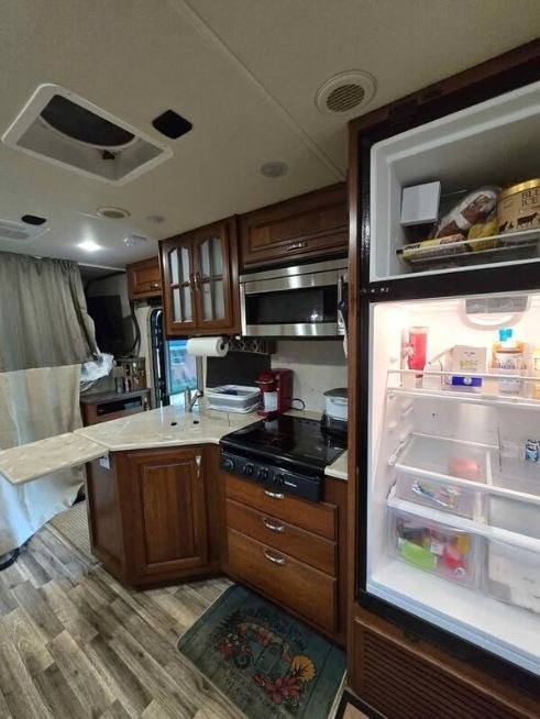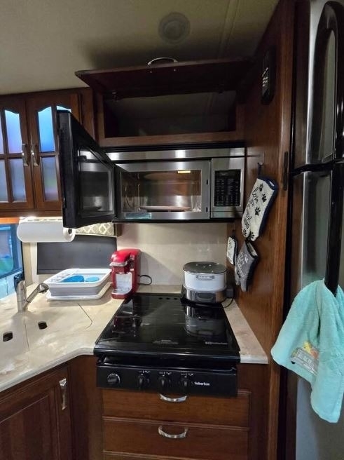 Kitchen: Residential refrigerator, three-burner range, convection microwave, and solid-surface countertops.