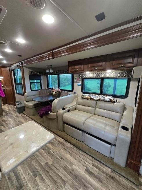 Technology: 8.4-inch LCD touch screen with U-Connect, Blu-Ray Home Theater system, and LED TVs in the living area and bedroom.
