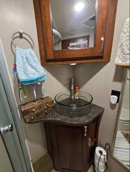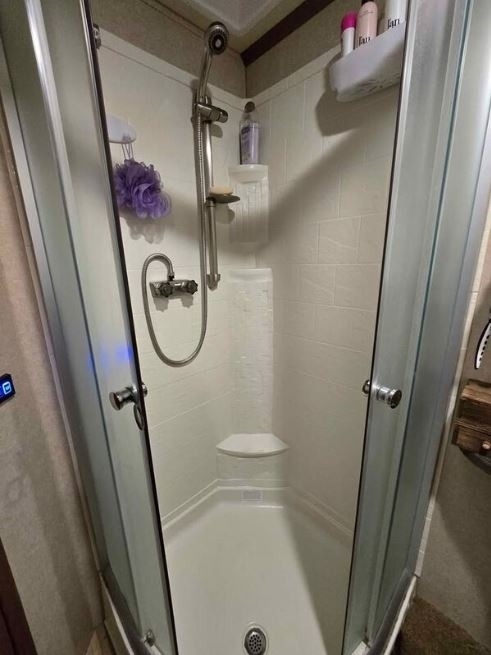 Bathroom: Side-aisle bath with a corner shower, sink, and toilet.