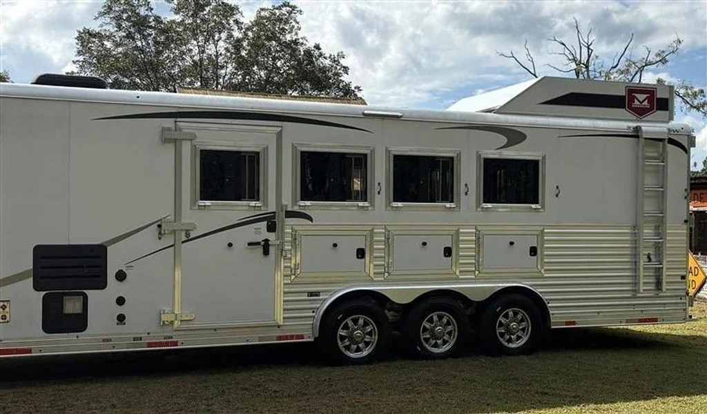 2017 Merhow 4 Horse Trailer with Living Quarters This 2017 Merhow 4 Horse trailer is a well-equipped unit designed for safe and comfortable equine transportation. It features four individual stalls, a spacious tack room, and full living quarters measuring approximately 12 to 13 feet. Amenities include a power awning, two-burner stove, fold-out couch with real mattress, slide-out, ramp, insulated roof, pass-through door, and extensive storage. The trailer has been well maintained, regularly serviced, and recently cleaned and sanitized. One-owner unit in excellent condition. Located in Statesville, NC 28625 For more information, please call 833-265-6113 and mention ID 7784