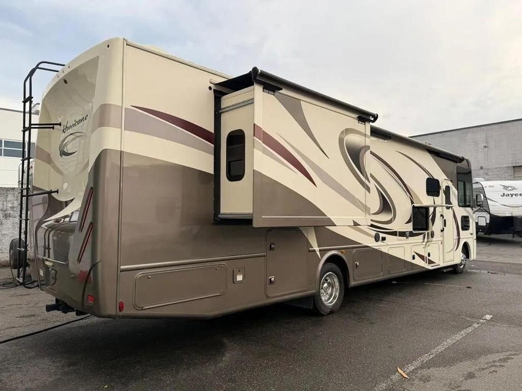 This 2018 Thor Hurricane 35M is a well-equipped Class A motorhome built on the Ford F-53 Super Duty chassis, offering a comfortable residential-style layout paired with dependable performance. With very low mileage at approximately 6,500 kilometers, this coach features a popular bath-and-a-half floorplan and two large slide-outs that expand the living space for extended trips or full-time use. Sleeping accommodations include a king-size bed, overhead loft, and multiple convertible options, allowing space for the whole family.
