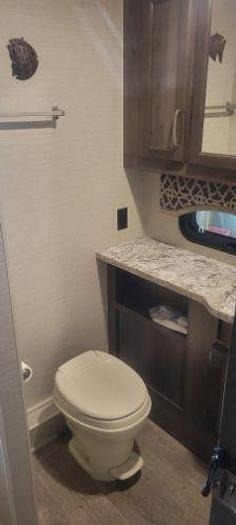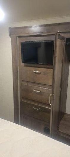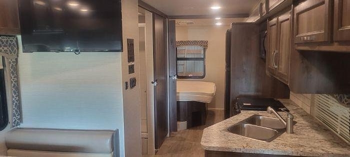 Storage is ample, thanks to full pass-through storage underneath, accommodating all your travel essentials without cluttering the living space. For sleeping arrangements, there's a comfortable bed over the cab and an electric shade for the front window, ensuring privacy and comfort.