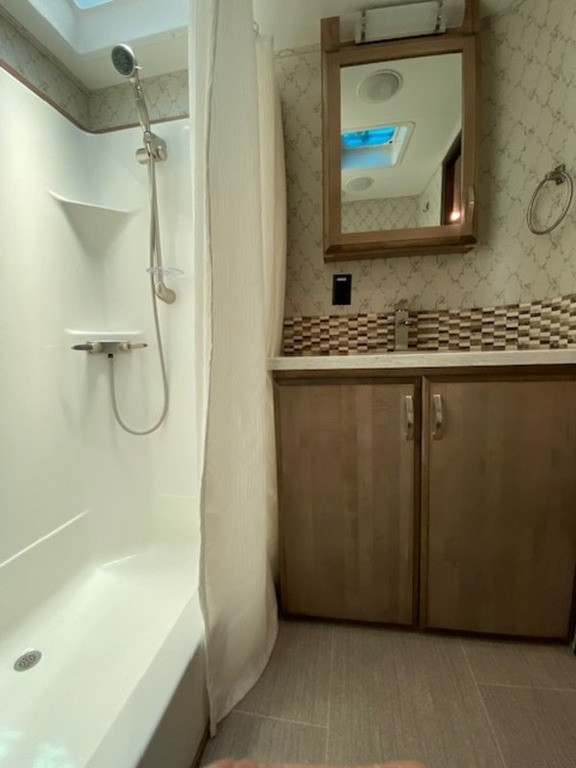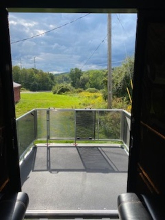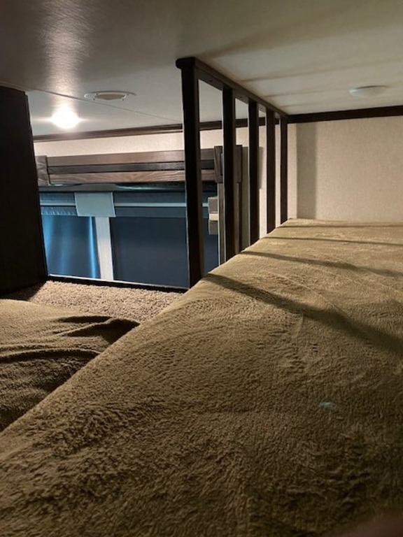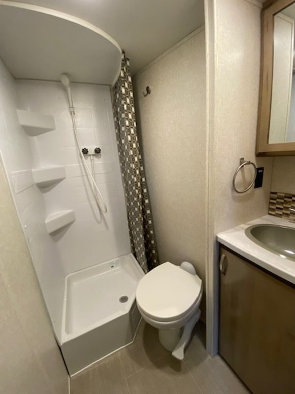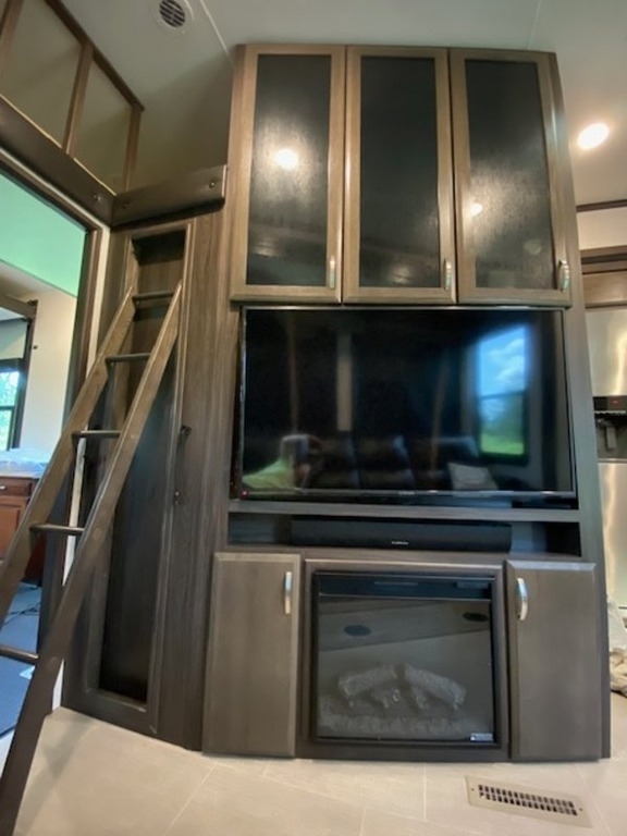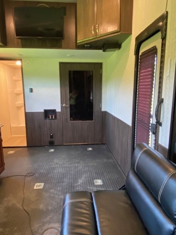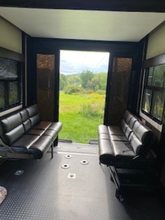 Relax in the living room on the 8-foot couch, complete with heated/cooled recliners that also offer massages, while watching a movie on the large TV above the fireplace, which features adjustable colors and heat settings for ambiance. This toy hauler sleeps 7 people comfortably, with a luxurious master bedroom offering a large, comfortable bed. You’ll also find 3 mounted TVs throughout, additional hookups, a CD/DVD/radio system, central vacuum, 50 amp service, air conditioning, and heat to keep you comfortable in all seasons.