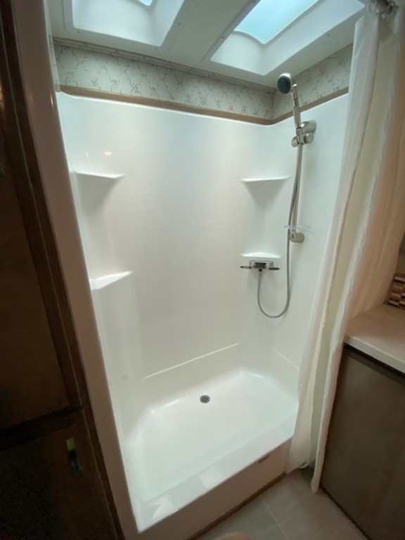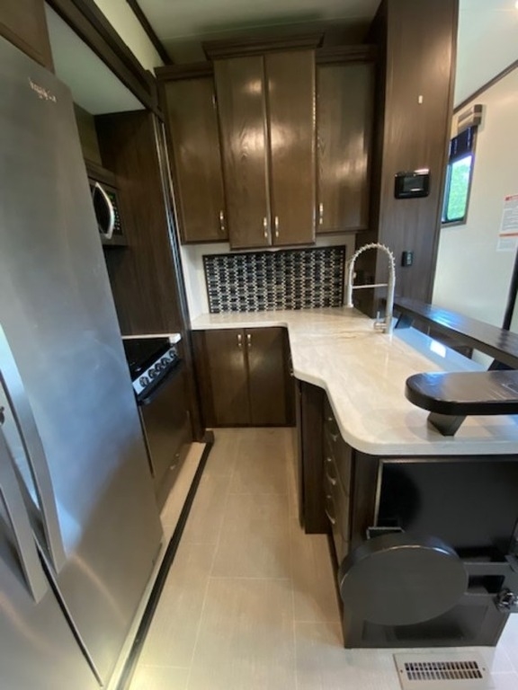 The power leveling jacks, three slide-outs, and a spacious party deck/ramp with railings and its own awning add functionality and style to your outdoor experience. Inside, the living area feels like home with two full bathrooms, a full-size refrigerator, a 3-burner stovetop, oven, microwave, and ample storage space. The kitchen is designed for both convenience and comfort, featuring two removable tables and fold-away stools for flexible seating options.