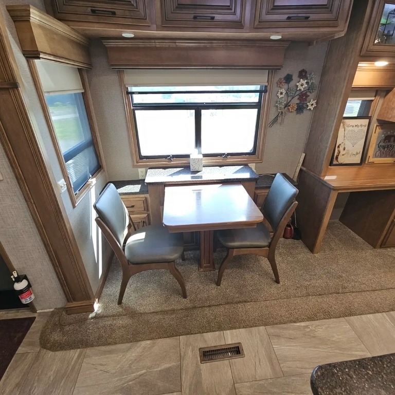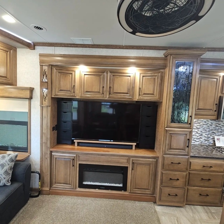 Constructed by DRV, a reputable manufacturer known for producing high-quality RVs, the Houston boasts a sleek and modern design that is sure to turn heads on the road especially with the beautiful custom paint. With its spacious interior layout with custom lambright furniture this fifth wheel provides ample living space for occupants to relax and unwind after a long day of outdoor adventures.