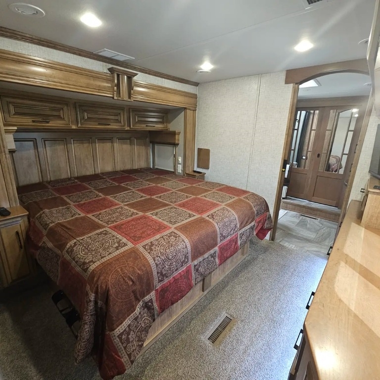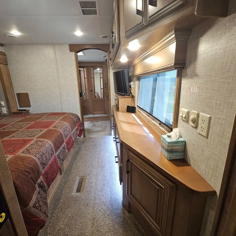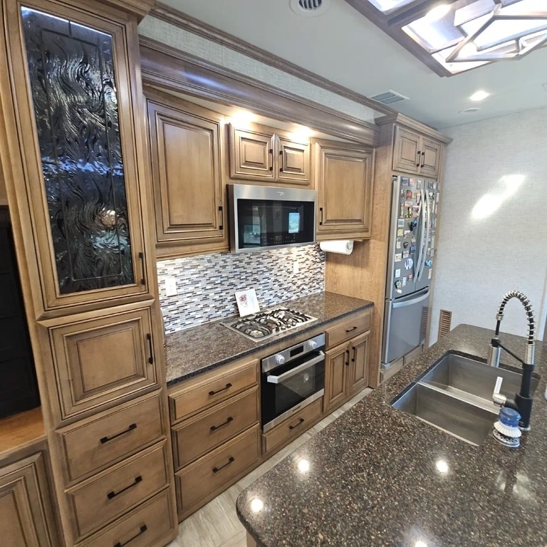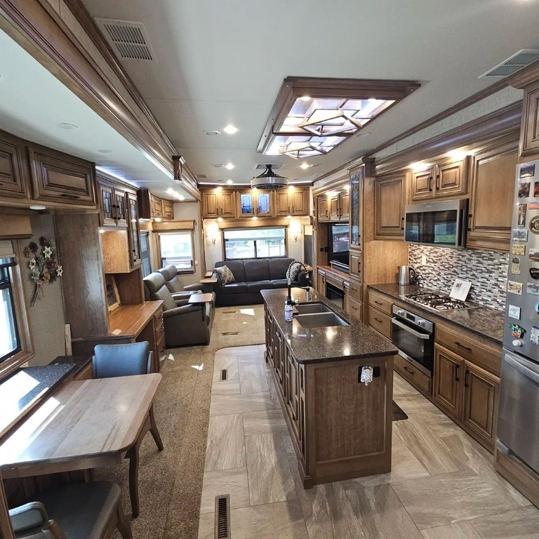 The DRV Houston is designed to offer a comfortable and convenient living experience for both short trips and extended stays. The interior features premium furnishings, state-of-the-art appliances, and high-end finishes incuding elite quartz counter tops and elite flooring throughout that provide a touch of elegance and sophistication. Whether you're cooking a meal in the gourmet kitchen, lounging in the cozy living room, or getting a good night's sleep in the plush bedroom, complete with full motion adjustable king bed, the Houston has everything you need to feel right at home.