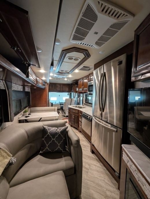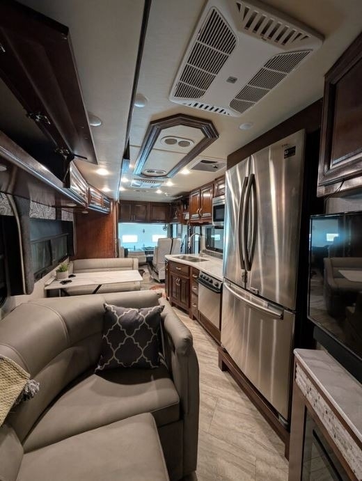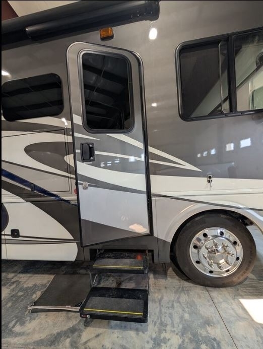 Highlights include a king-size bed, fireplace, large residential refrigerator, upgraded suspension components, modern entertainment system with smart TVs, Bluetooth audio, satellite wiring, and privacy blinds throughout. Recent maintenance includes new batteries, replacement hot water heater, upgraded step motor, and front suspension improvements to enhance ride quality and fuel efficiency. Clean title and ready for immediate travel.