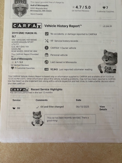 2019 GMC Yukon This 2019 GMC Yukon XL SLT 4WD is an exceptionally well-maintained full-size SUV that offers impressive capability, comfort, and premium features. Powered by a reliable 5.3-liter V8 engine, it provides strong performance and smooth highway cruising while maintaining excellent durability. With only 34,000 miles on the odometer, this Yukon has been carefully preserved and shows minimal wear. It has never been driven in winter conditions and has been stored for extended periods, only being used occasionally for summer trips. The exterior remains in outstanding condition with no dents or scratches, reflecting the careful ownership it has received. Inside, the Yukon features a spacious cabin with seating for passengers and generous cargo capacity, making it an ideal vehicle for families, travel, or towing duties. Equipped with a full range of factory options, it delivers a premium driving experience with comfort and convenience throughout the interior. With its clean title, low mileage, and excellent condition, this Yukon represents a great opportunity to own a dependable and well-equipped SUV. Located in Minneapolis, MN 55357 For more information, please call 833-265-6113 and mention ID 71273