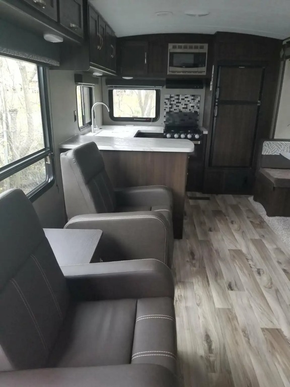 Discover the ultimate in travel comfort with the 2019 Keystone Springdale 293RK travel trailer. Designed to provide maximum convenience and comfort, this trailer boasts a spacious rear kitchen layout equipped with ample counter space, a three-burner stove, an oven, a microwave, and a large refrigerator, making meal preparation easy and enjoyable. The open floor plan extends into a cozy living area that features plush seating and a convertible dining area, perfect for entertaining or relaxing after a day of adventure. The private master suite offers a comfortable sleeping arrangement, complete with storage solutions to keep your belongings organized. The fully equipped bathroom includes a shower, vanity, and toilet, ensuring all the comforts of home are always within reach. Additional features include air conditioning and heating climate control, entertainment system, and storage compartments for your travel essentials. This travel trailer is meticulously designed to ensure a seamless blend of style and functionality, making it an excellent choice for both short trips and extended stays.