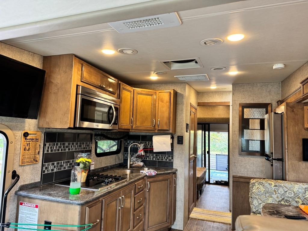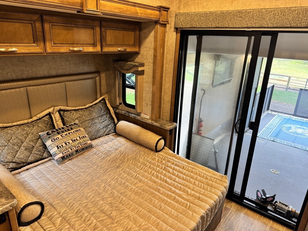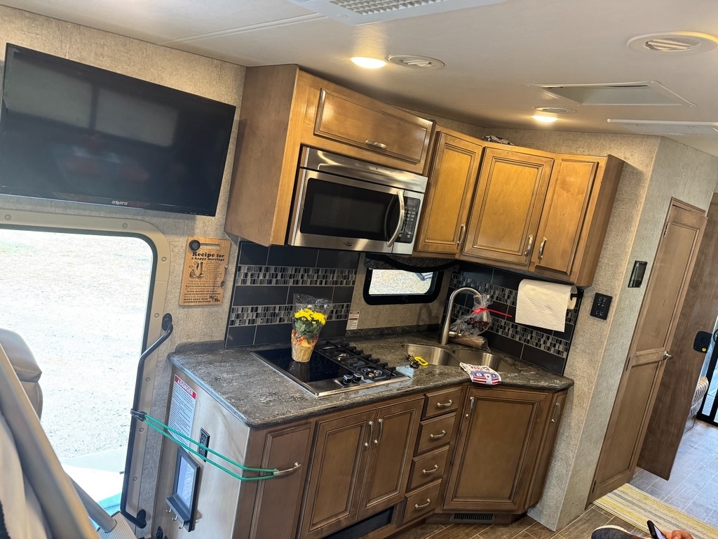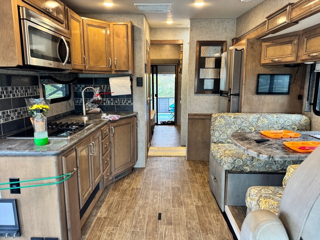 This motorcoach was our dream home on wheels, and it deserves to be enjoyed, not stored away. It’s fully equipped, well-maintained, and ready for your next adventure. Built on a 2019 Ford chassis with a 6.87L V10 engine and 320 horsepower, this 38-foot Class A toy hauler has just 15,000 miles. It features two slide-outs, an 8x10 rear garage with a winch and wheel chock system (perfect for a motorcycle and bikes), and a sleeping capacity of 7+ including a sky bunk, queen bed, loft, and convertible dinette.