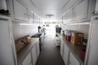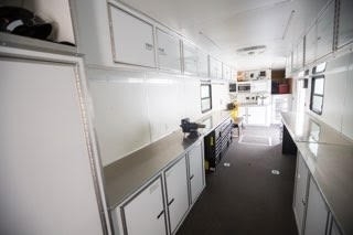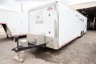 This 2020 Heine bumper hitch trailer is a well-built, fully outfitted enclosed unit ideal for mobile service, racing support, construction, or equipment transport. It features a clean, insulated interior with extensive overhead and lower cabinet storage, a large workbench/toolbox setup, and additional built-in shelving to keep gear organized. The rear section includes a workspace lounge area with cabinets, countertop, microwave, and onboard air system, making it convenient for longer days on-site. The trailer has a side entry door for easy access, bright interior lighting, and a durable floor designed for heavy use. With its professional layout and high-quality construction, this trailer is turn-key and ready to be put straight to work.